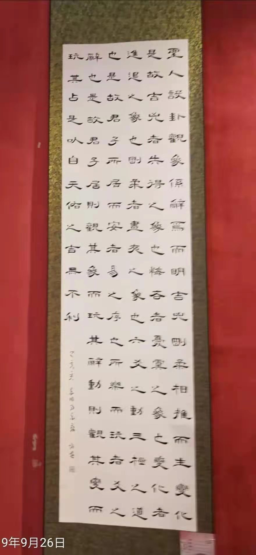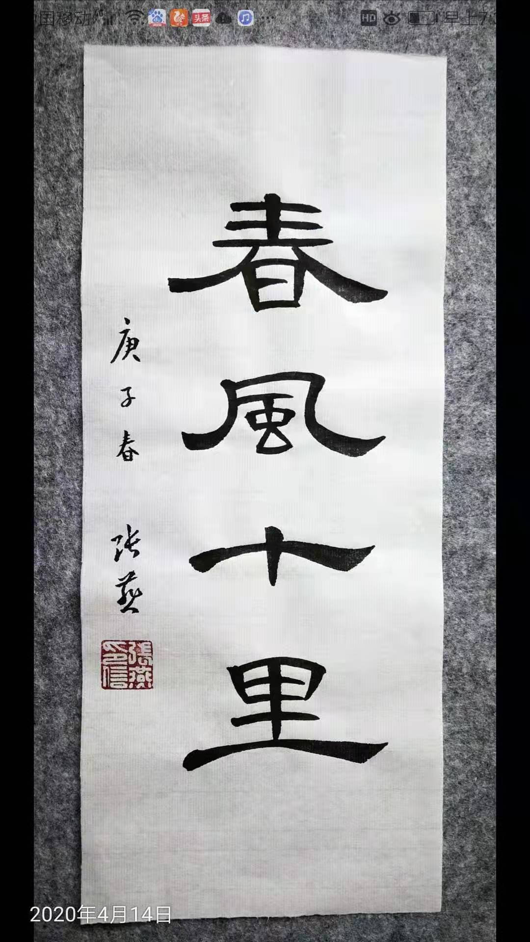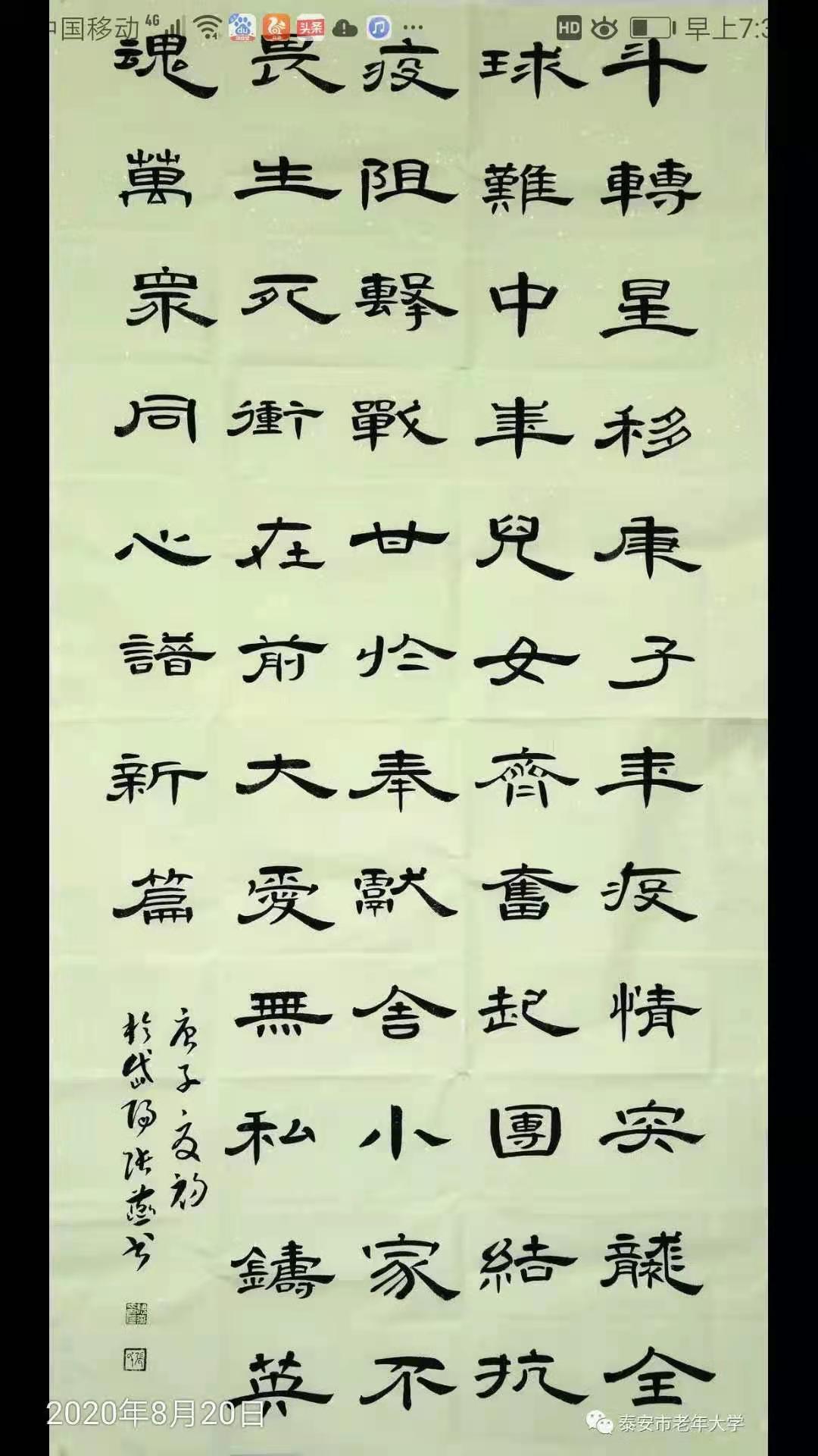 我从小喜欢写字画画。在学校和工作单位中,凡是搞宣传、黑板报、刻蜡板等文字工作都是交给我完成。招工后分配工种也得益于此,直接进了机关做文秘兼打字工作,工作之余我最大的兴趣就是读书写字,尤其喜爱书法艺术。我学习和临摹比较多的帖子有:欧阳询《九成宫》、汉隶《曹全碑》、孙过庭《书谱》、《集王羲之圣教序》。退休后一直在老年大学书法专业学习。近几年,也选择网上有关书法学习课程。徜徉于汉字的时光长廊;体味书写的敬意与喜悦。