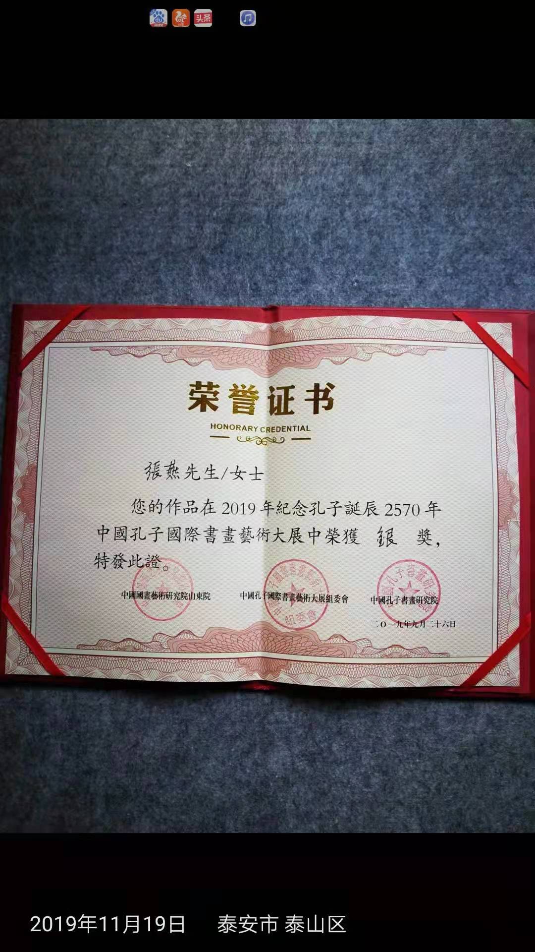 2019年9月纪念孔子诞辰2570年,“中国孔子国际书法大展”中荣获银奖。2020年6月初,山东省委组织部开展“书画捐赠武汉抗疫归来的医务工作者”活动,做七律诗一首,作品入选并捐给了“最美逆行者”。