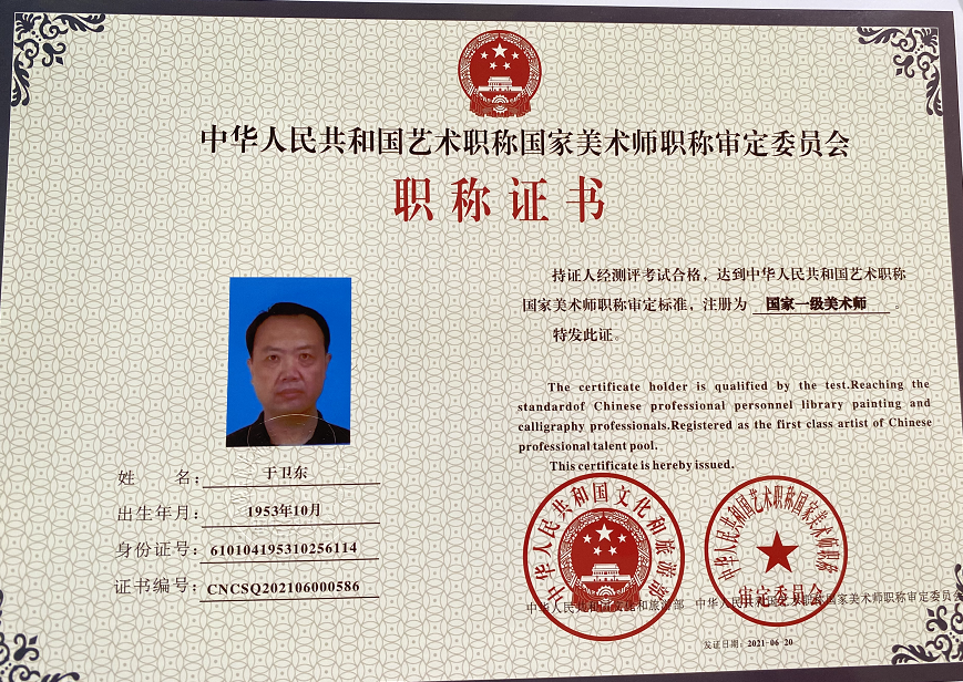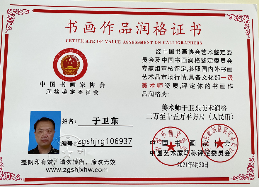 于卫东(偉东),陕西省美术家协会会员,中国文化旅游部2020年《抗疫情全国美术作品巡回展》一等奖获得者,主题画家。国家一级美术师资格,中华炎黄书画研究会理事终身签约画家,中华优秀传统文化艺术行业(陕西区)终身教授。