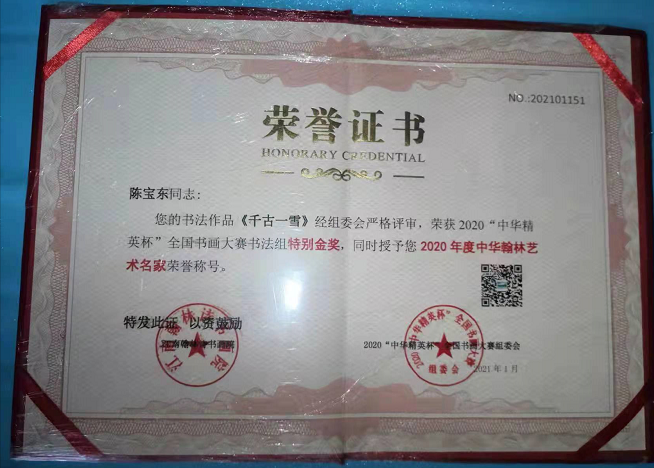 2o22年2月参加全国抗疫情书画作品展书法作品荣获一等奖,3月应中国艺术人物专题报道评为《人民艺术家》称号并颁发人民艺术家奖杯。3月16曰应邀人民艺术馆入驻注册为人民艺术家。
