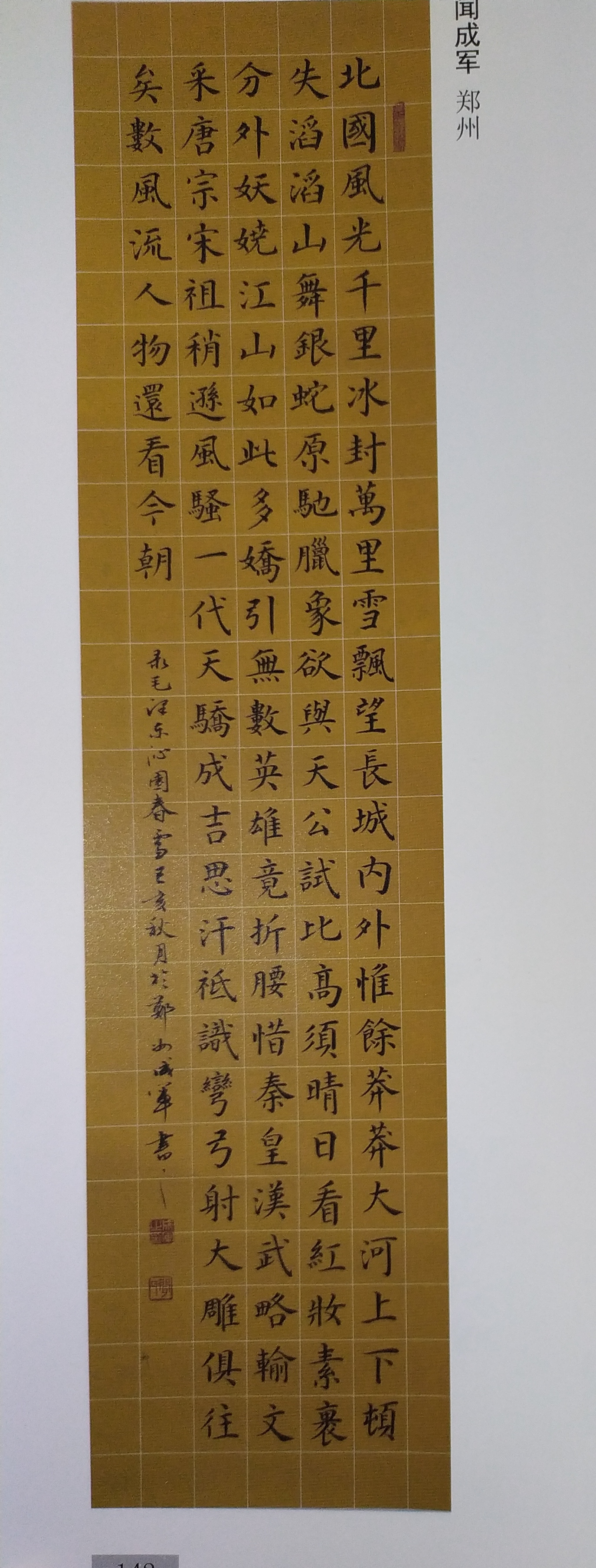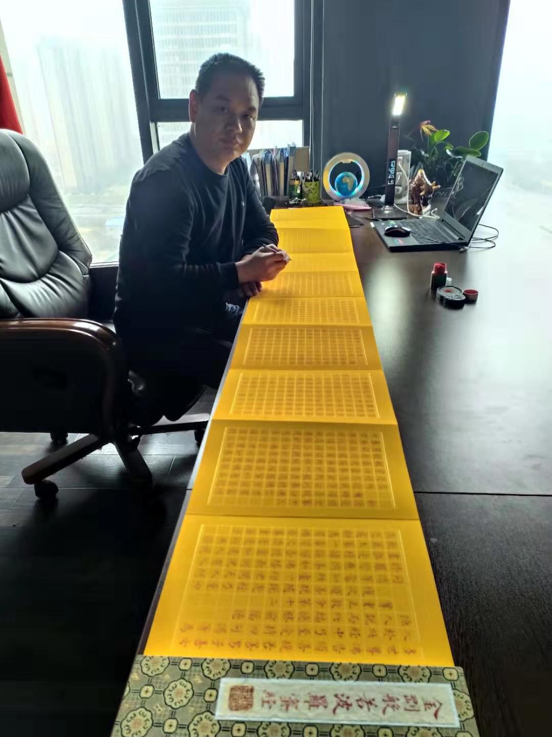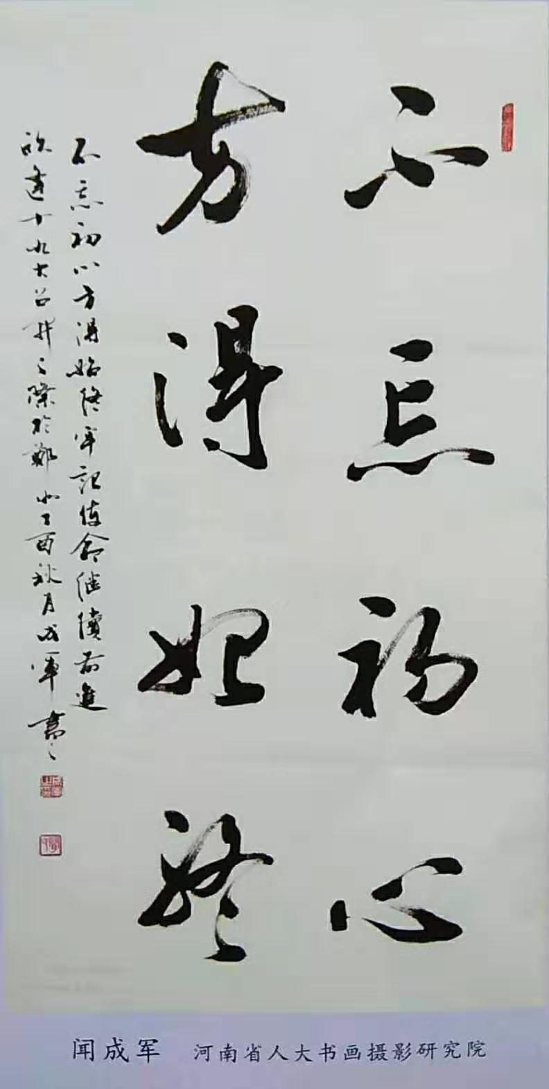 闻成军,号百经堂主。男,汉族。生于1967年,河南西峡人,中共党员,中国书法家协会会员。自幼习书,初学颜真卿《多宝塔碑》后临柳公权《神策军碑》,深得颜柳精髓。后临王羲之集字圣教序、兰亭序,几十年笔耕不辍,书风独树一帜,榜书作品厚重端庄,气势磅礴。楷书亦自成一家,尤其是朱砂小楷《金刚经》册页,《道德经》长卷等,吸收融合了《灵飞经》、赵孟頫《汲黯传》、文征明《桃花源记》等历代名家之优点,用笔精细,字体端庄秀美,深得佛教,道教及各界人士好评。
