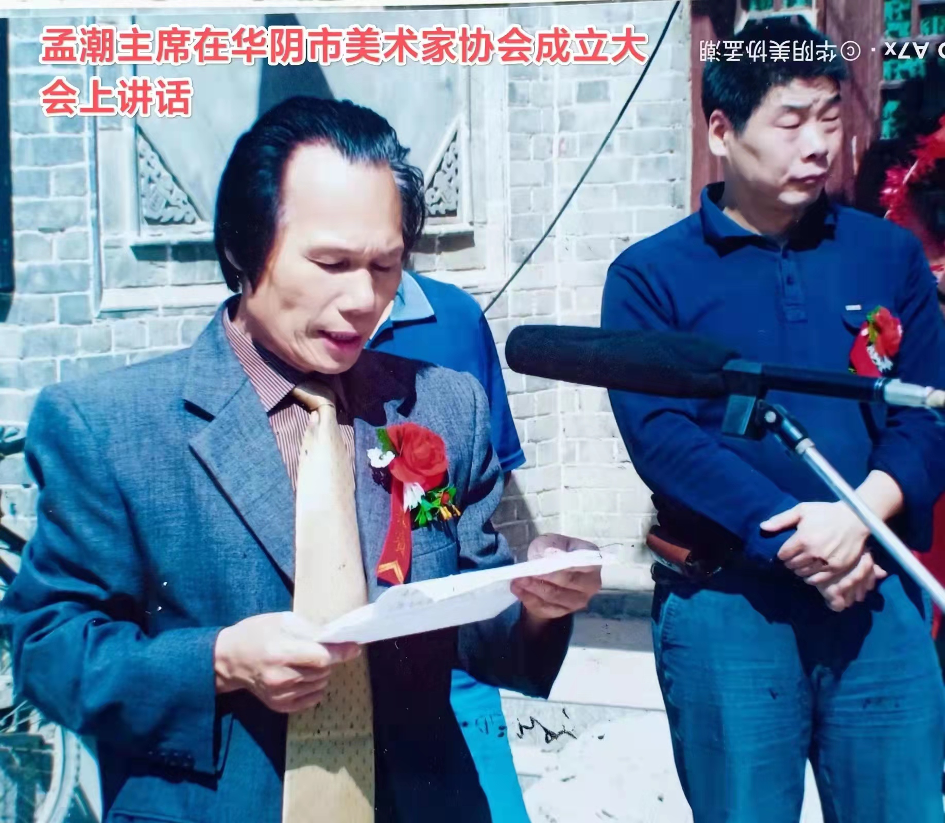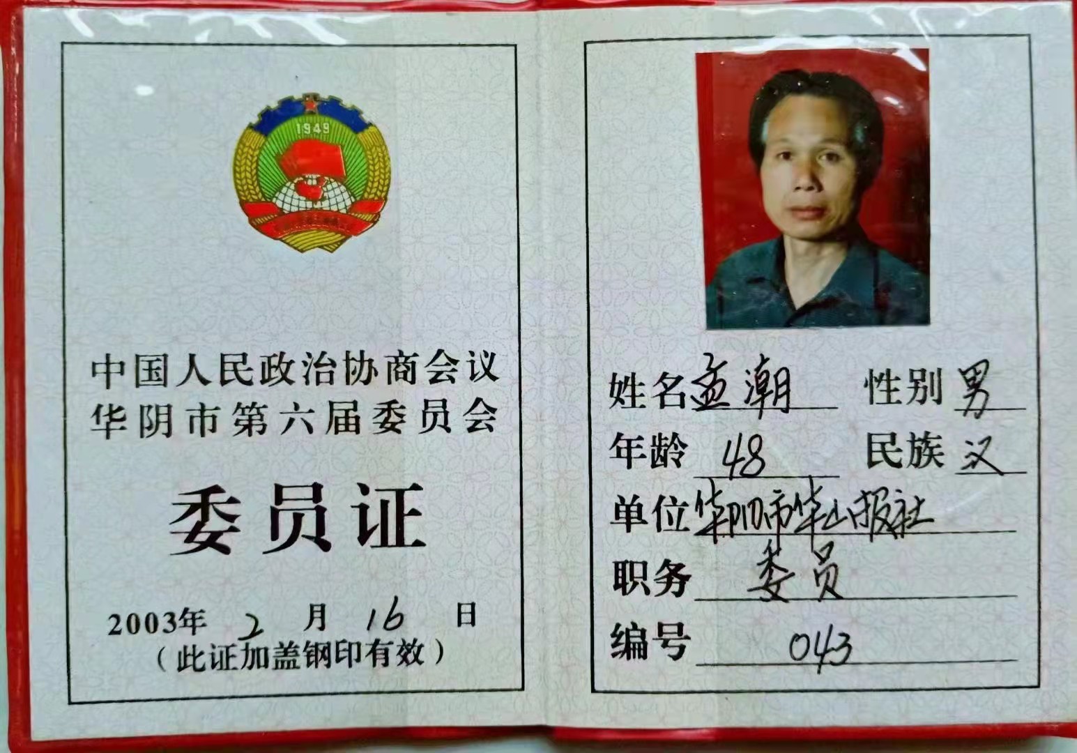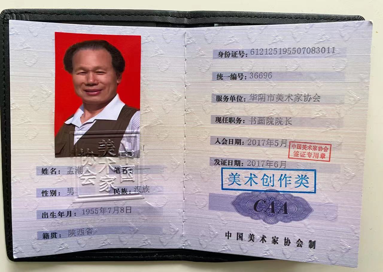 孟潮,一九五五年生,陕西省华阴市人,华阴市委宣传部退休干部,华阴市政协第六届委员。一九七一年参军,曾服役中国人民解放军铁道兵某部五0团通信班,任五0团文艺宣传队舞美设计。一九七六年七月一日加入中国共产党,同年受部队推荐到中央民族学院艺术系学习美术专业,一九八二年在西安美院进修,后进入《华山周报》编辑部、华阴市宣传部工作。