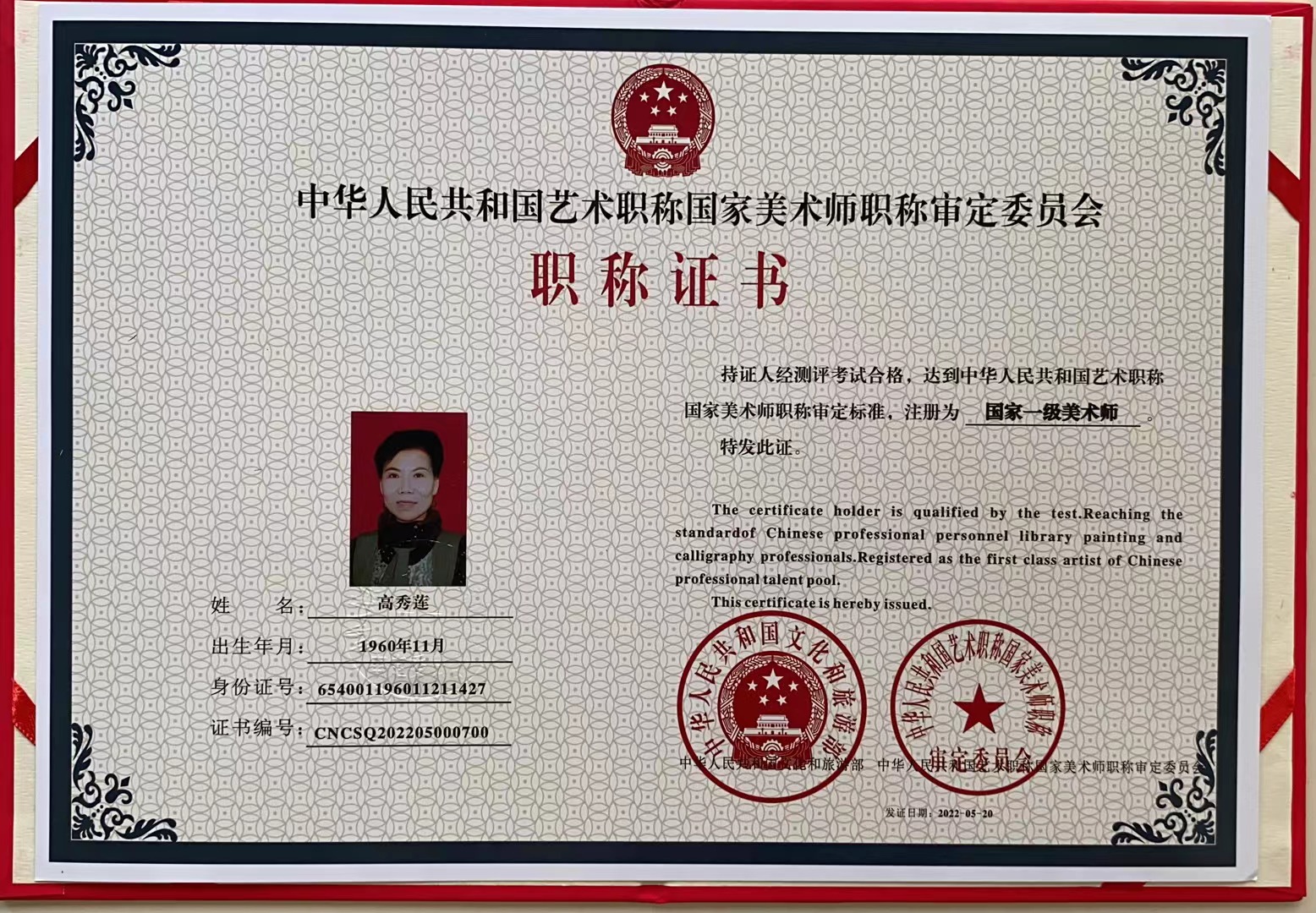 高秀莲:生于新疆,祖籍甘肃,現为新疆美术家协会会员,中国老年书画家协会会员,西安市同仁书画研究院理事。中国国学书画研究院新疆分院理事。北京博雅荟萃书画院理事…。自幼爱好书画,利用空余时间学习传统山水画,多次参加著名现代彩墨山水画家张国民老师举办的现代彩墨山水高研班,研习山水画,所画山水作品气格高远,风骨悠然。其构图上採用传统的近浓远淡,近实远虚的透视技法,使整个画面自然,丰富,和谐,统一。即展示立意精神,又营造直观效果,力求体现画由心生,境由心造的艺术魂魄,富有强烈的生活气息。行笔灵动,气势雄伟,又兼具秀雅之气,尤其是西域山水,胡杨,画作秀雅高古,质朴,浑厚,大气,豪放,动中有静,巨中有微,画中有意,画外有情,近看有质,远观有形,细品有味,放眼有势。形神兼备。章显中国画在虚实有无中追逐玄机禅意,寻找生命与精髓。集众家所长吸名家之精华,格调高雅厚重,功底深厚扎实,其画作华奕照耀,动人无际。禅意浓厚在书画界独树一帜。作品多次参加国内外书画大赛并取得各类大奖。个人成就2018“大爱新疆”公益书画大赛中获奖二等奖,并被评为“爱心艺术家”2018年首届“无极杯”全国书画大奖赛中(国画)获得一等奖。2018年全国诗书画家创作一等奖。荣获第二十届"世界华人艺术大会"香港大型艺术展国际铜奖。2018年荣获庆祝改革开放40周年暨中韩建交26周年周年国际名家名画展优秀奖。全国第七届中国梦想杯诗书画大赛银奖。2018年作品《白杨精神》荣获首届“茶殿杯”全国精品书画展金奖。2018年作品《山水》荣获首届“茶殿杯”全国精品书画展金奖。2019年新中国成立70周年“祖国颂"全国书画大赛金奖。2019年全国第三届一带一路“中华国礼杯“书画大赛银奖。2019“迎春杯”全国精品书画大展金奖第20届世界华人艺术大会香港大型艺术展评选活动中荣获国际铜奖。建国70周年,首届“蒲松龄"杯全国精品书画大赛金奖,并授予“建国华诞70周年功勋艺术家"称号。2019百名艺术家“英才杯″全国书画大赛金奖,同时授予2019全国百名优秀书画名家称号。献礼建国名家名作全国联展2019“华夏品牌艺术名家荣获优秀艺术家号。庆祝新中国成立7o周年全国首届当代翰墨名家作品展一等奖。荣获2o2o众志成城战疫情“中华大爱"全国书画大赛特别金奖。2o20《助力抗疫,特别征稿》同