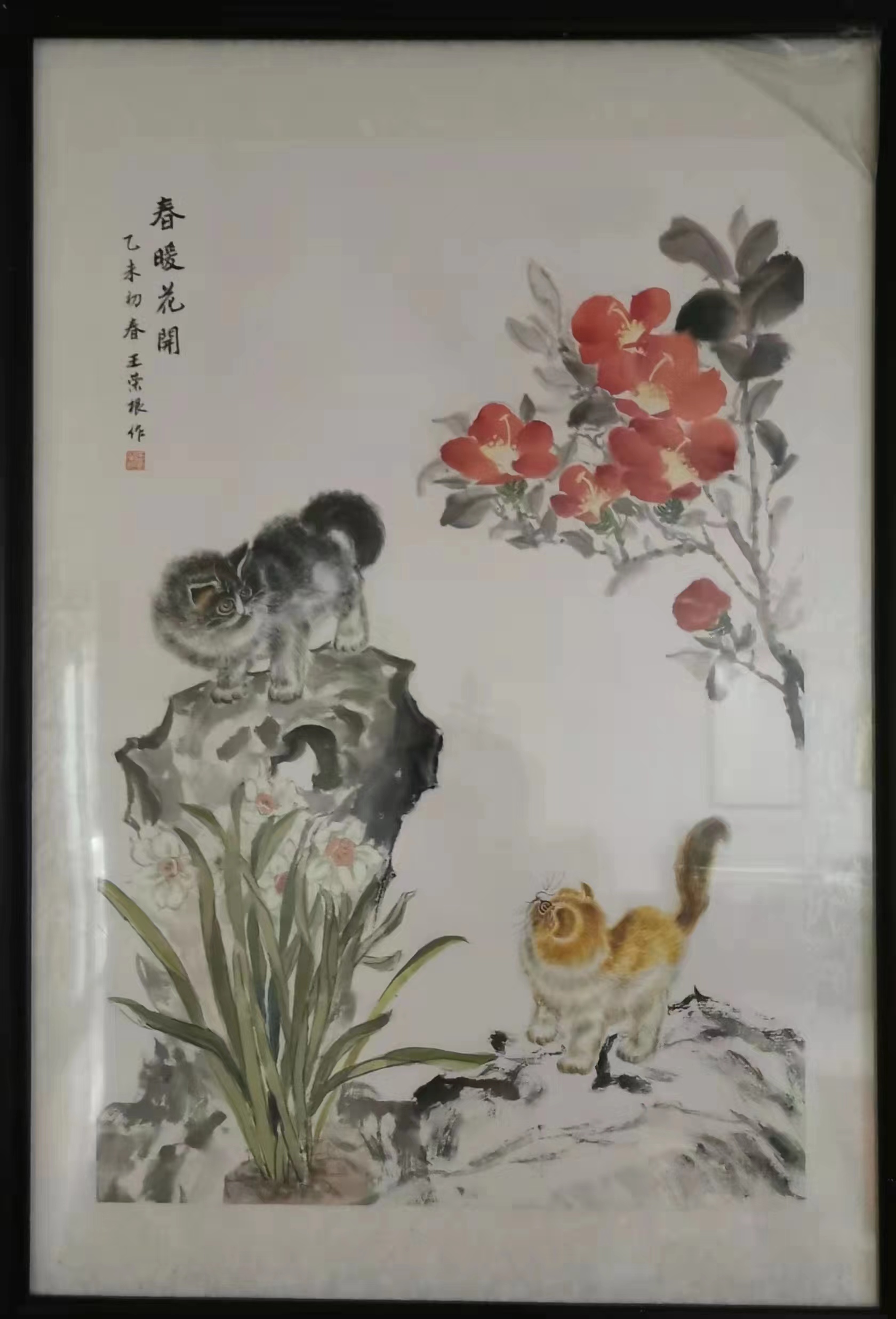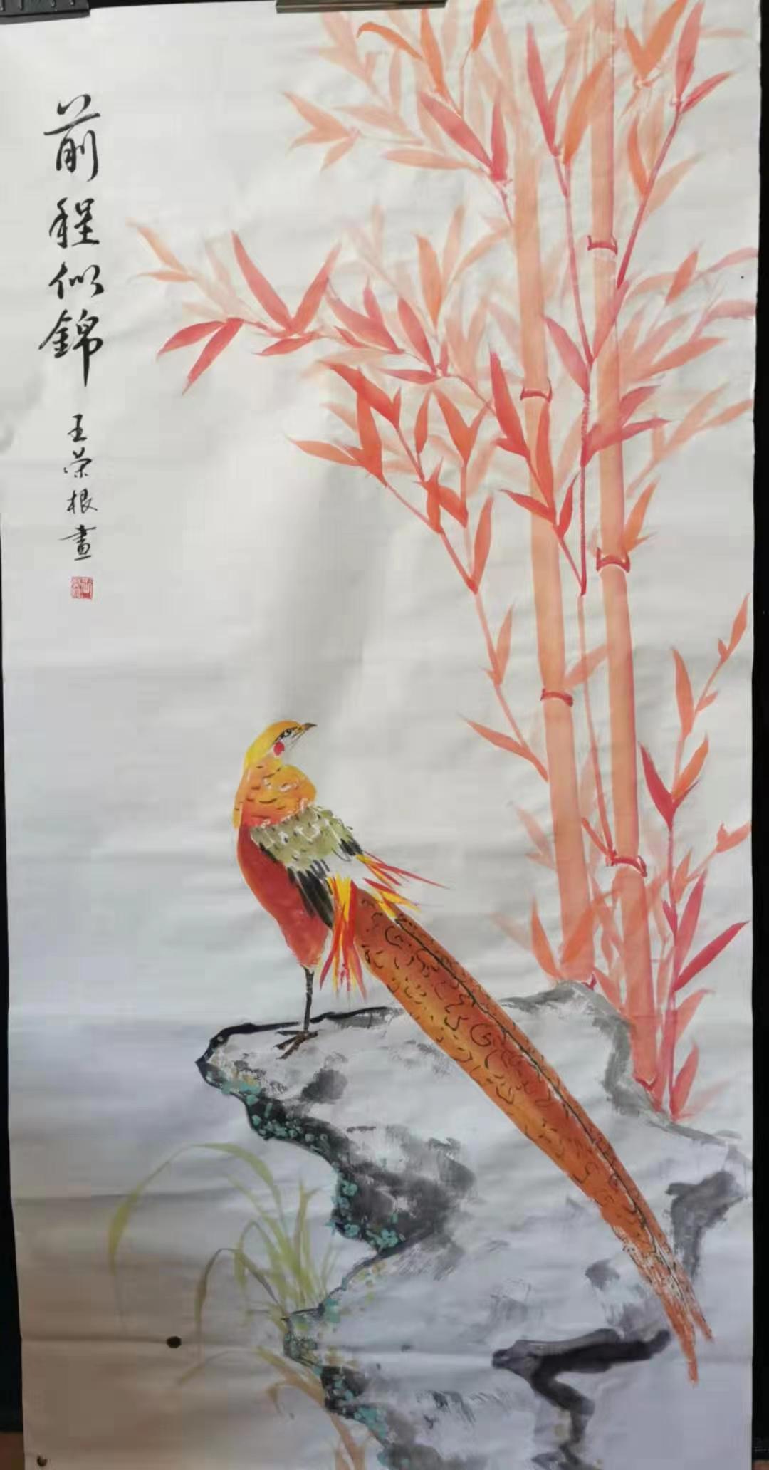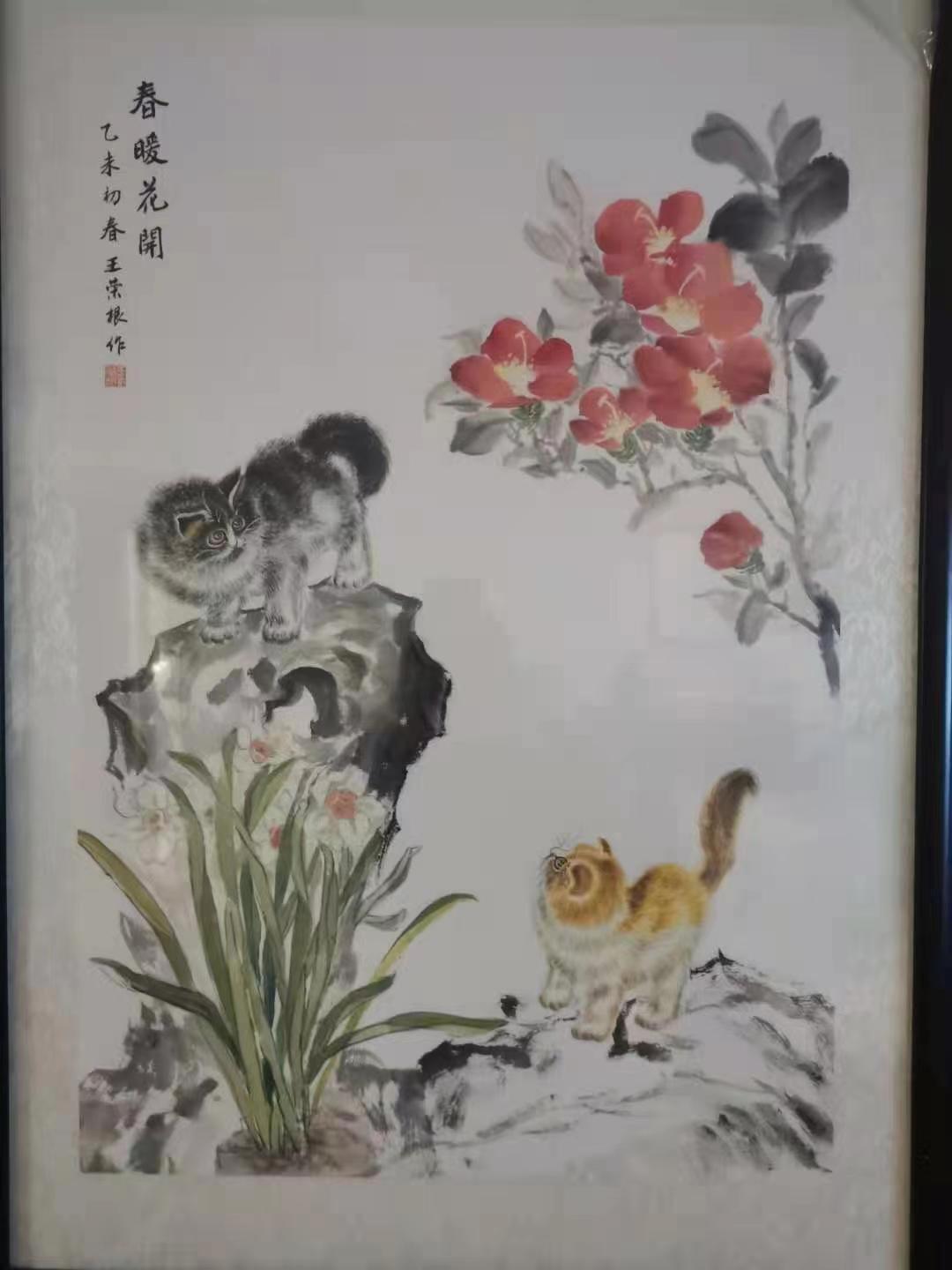他的篆刻师从西泠印社社员李文骏,他对篆刻一往情 深。如痴如醉,经常拿起刻刀,一刻就是几个小时,进 人无人状态。他的右手拇指、食指和中指上磨出厚厚的--层老茧。经过多年的刻苦努力、深人研究,取得了较 高成就。书法、绘画、篆刻三者的结合,相互辉映,相 得益彰,体现王荣根深厚的艺术素养。