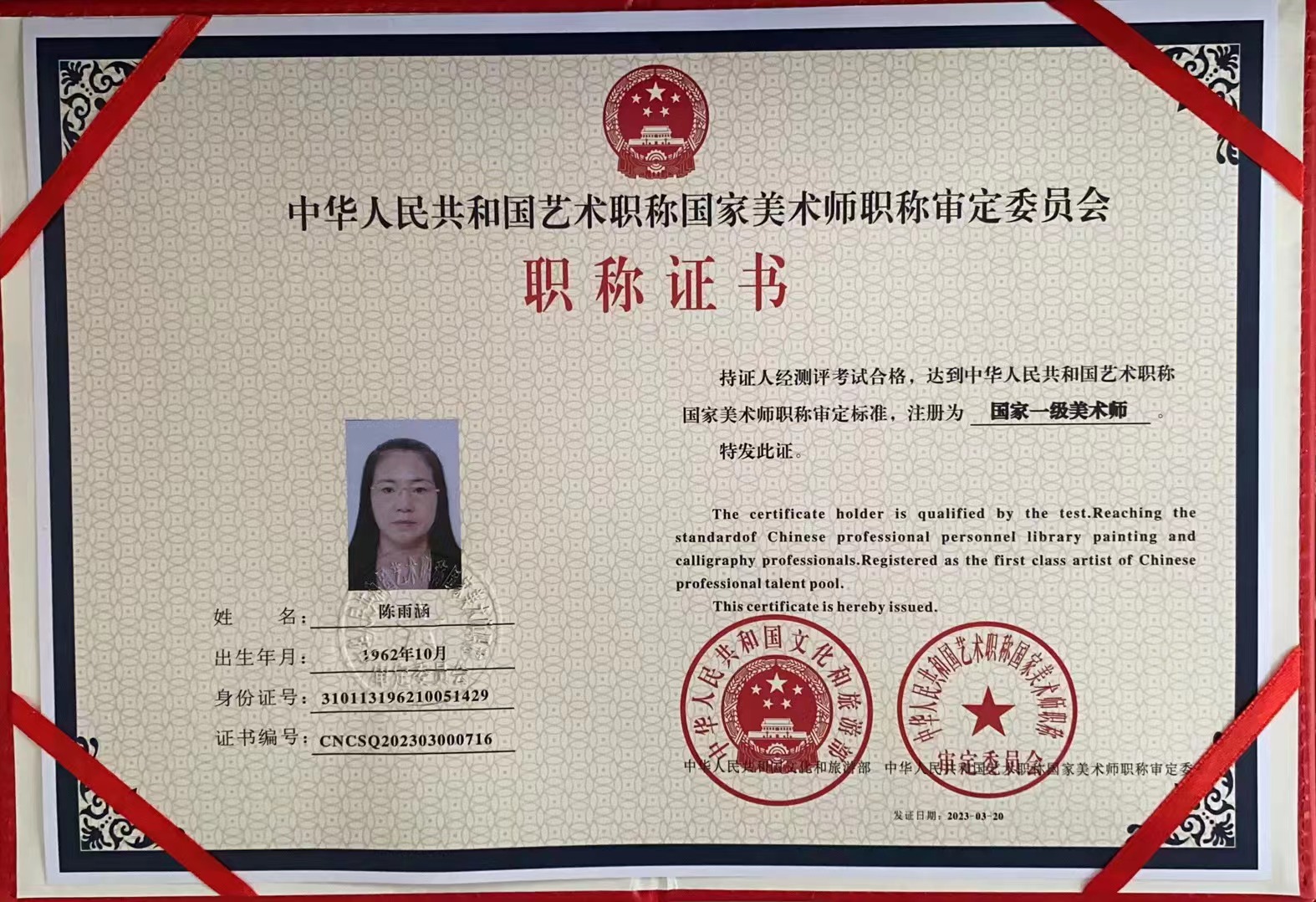 陈雨涵,女,1962年10月出生、自幼酷爱美术,拜中国当代著名彩墨中国画画家曾刚老师为师,研习曾派彩墨国画、多年来勤奋刻苦耕耘、积极参加全国各省市书画大展、同时分别荣获各种奖项、她的花鸟山水功底深厚特别侨联举办书画大展多次获奖深受艺术界好评和认可、在2012年获上海市白玉兰终身学习奖、现在职于上海市老年大学彩墨画任教师。现为中国美术家协会会员、国家一级美术师、两会艺术家代表、香港特别行政区文联美术家协会会员、黑龙江省中华炎黄文化研究会民俗文化传承保护研究会常务理事、炎黄书画院副院长终身签约画家。