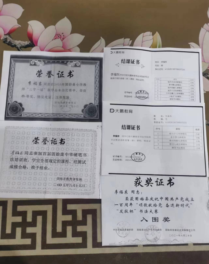 2020年8月进修于山东省大鹏教育书法培训2021年1月结业。