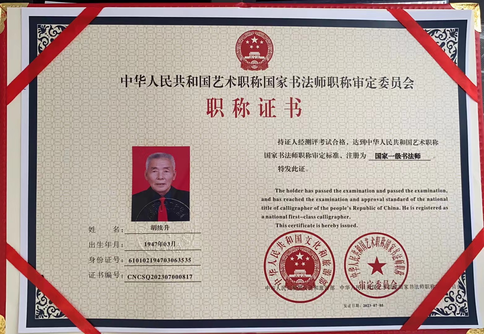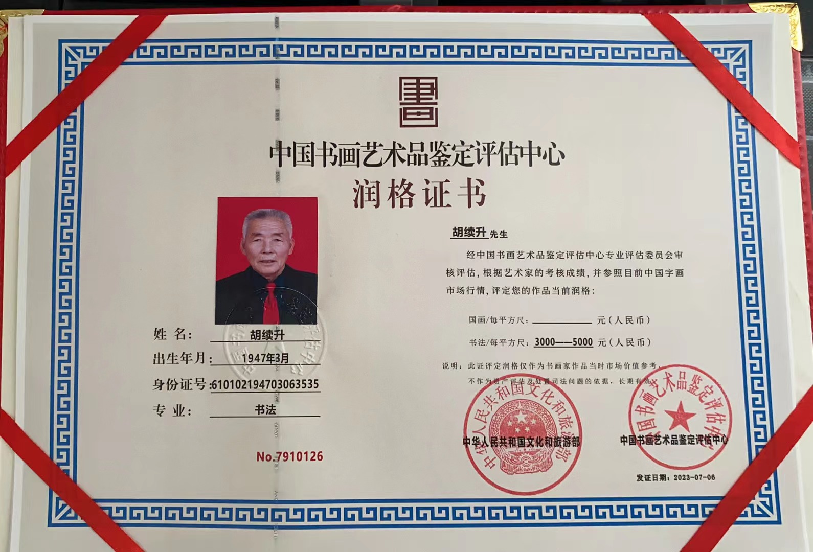 胡续升1947生,是中国共产党党员,从西安第一机械工业学校毕业后被分配到国防单位工作。自幼喜爱书法,临过王羲之的草书,颜真卿的楷书。研习过篆书、隶书,对真草隶篆四种字体都懂一些。现在是中国书画家协会会员,吴门八雅书画协会会员,西安老年书法协会会员,长安书协会员,西咸新区书协会员,西部书画院会员,炎黄书画院副院长,终身签约书法家。