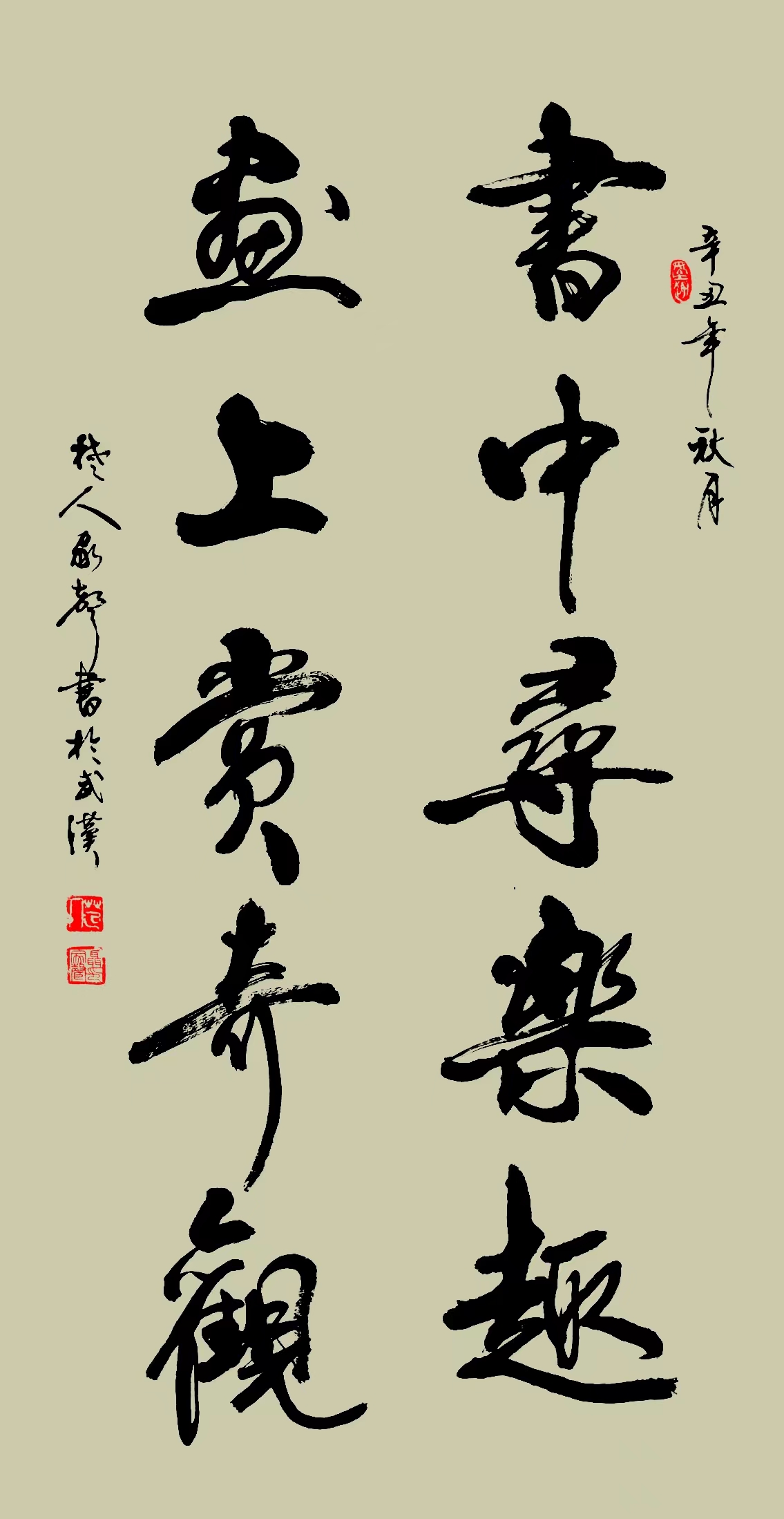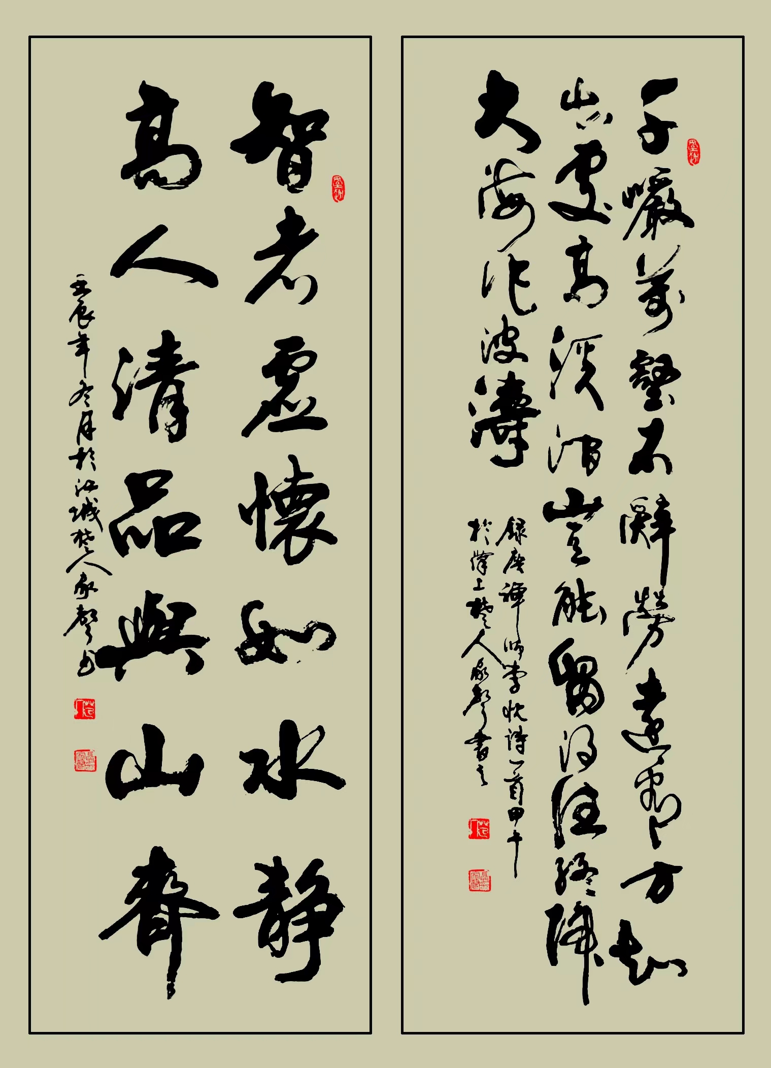 他的书法结体气势开张,同时又新奇而有韵致。在粗与细,虚与实之间,呈现出的是彼此的关联与笔势上的呼应。笔力雄强圆厚,气势磅礴,颇具“颜筋柳骨”的风格。在线条的起落移动中灌注一腔豪情,在笔墨的动势中洋溢着生命的颂歌,借助古今吟浦的多诗,营造出潇洒磊落,古朴高雅的书法意境,每幅书法作品都闪耀艺术的光芒,堪称精品,具有收藏价值。