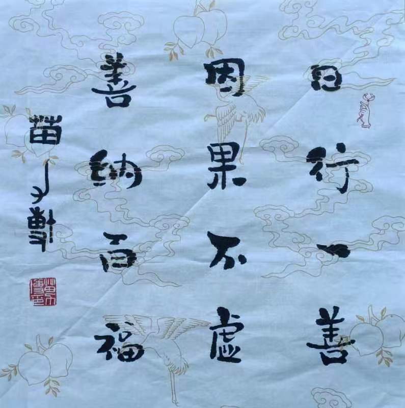 源于传承,善于领悟,其主要作品有,道德经、三字经、千字文、弟子规、兰亭序、唐诗宋词;在内容意境中糅和书法精神,并通过线条与布局,巧妙地解读书法的文化内涵,行笔自然真淳,气象多元,有雅有拙。作品因意境涵义而多变,有长城型、葫芦形、蝴蝶型、地图形、宝塔型、心型等等,表现出对传统文化的追求与个性新意的创造,作品中展现出创造的形态美和意境美。多次参加公益活动,深受欢迎,许多作品被企业家和国际友人收藏。