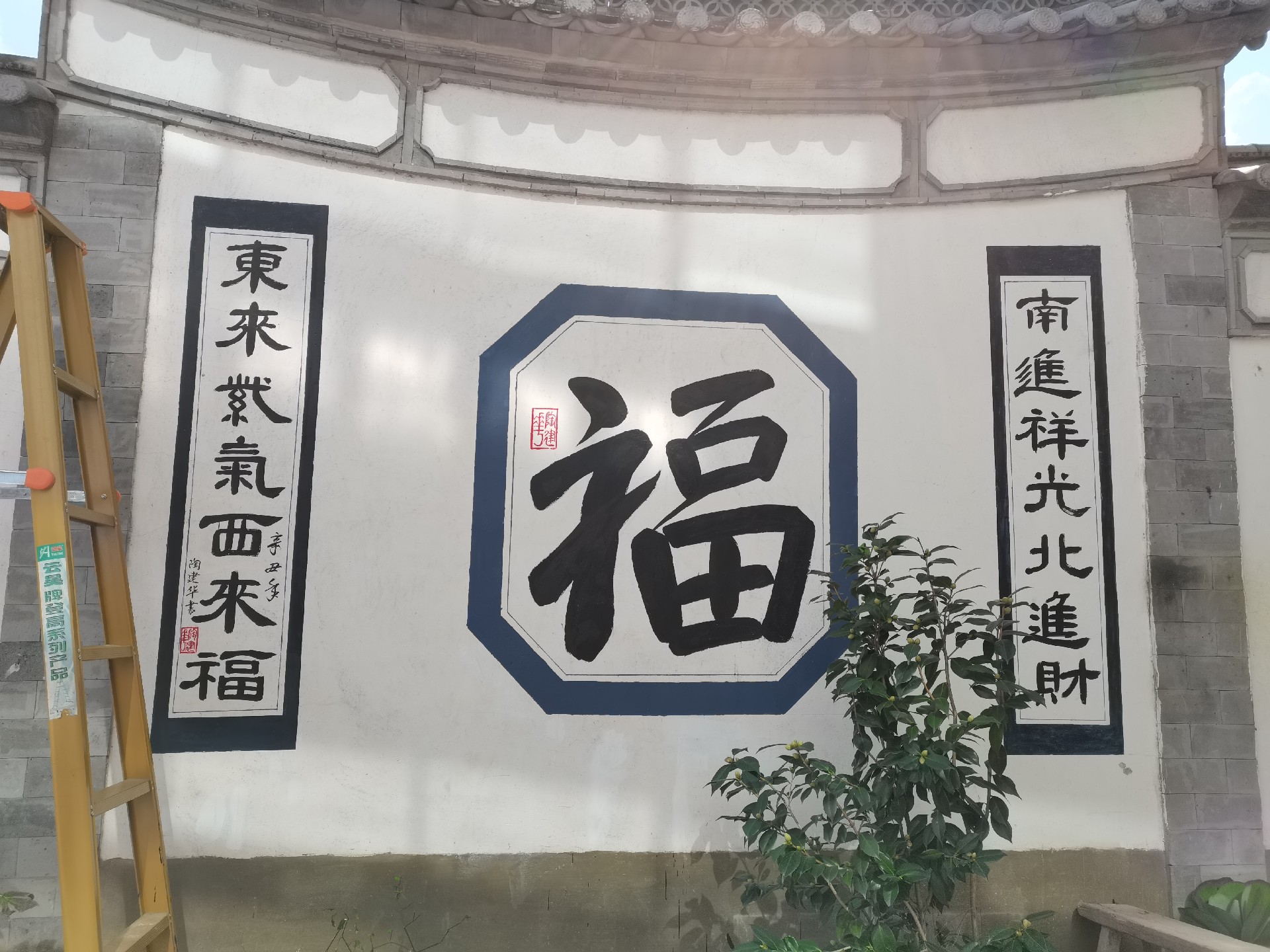 陶建华,笔名:逍遥子,由于外公是书法美术教师,在外公的教导下学习毛笔书法,后主要临摹柳体、颜体,受朋友的邀请经常在当地别墅庭院、寺庙、墙壁等提字。