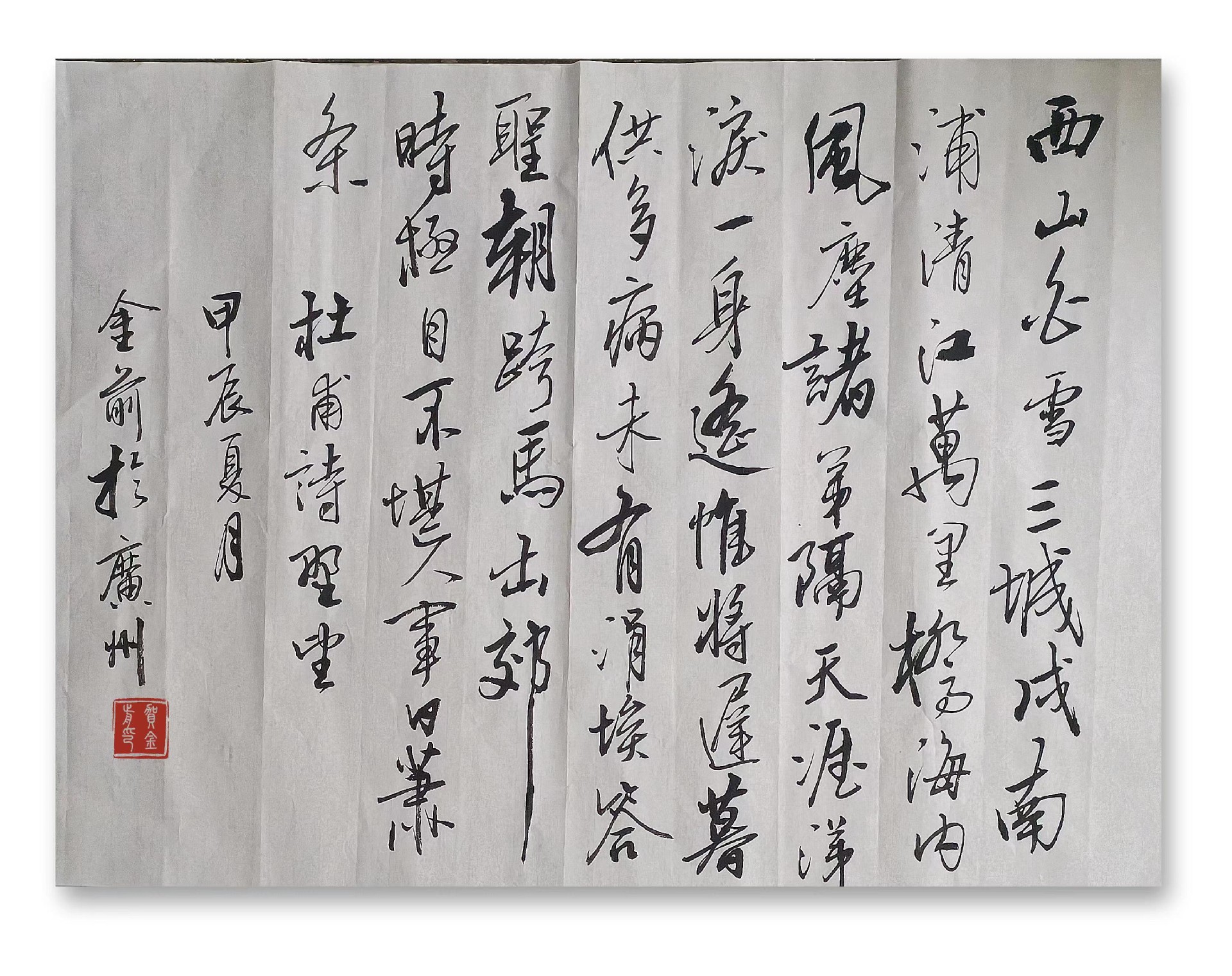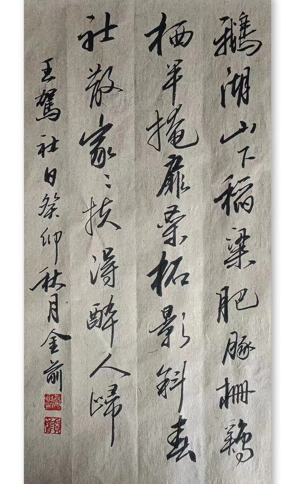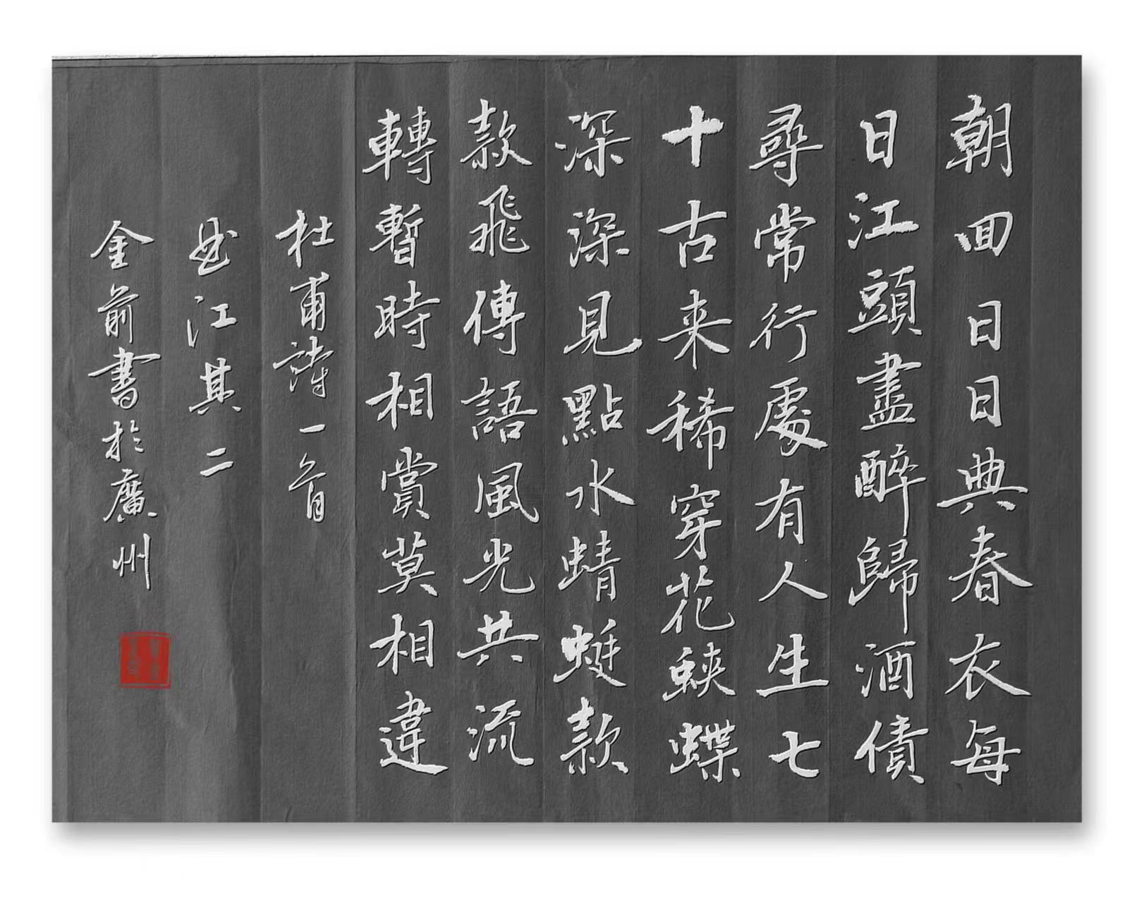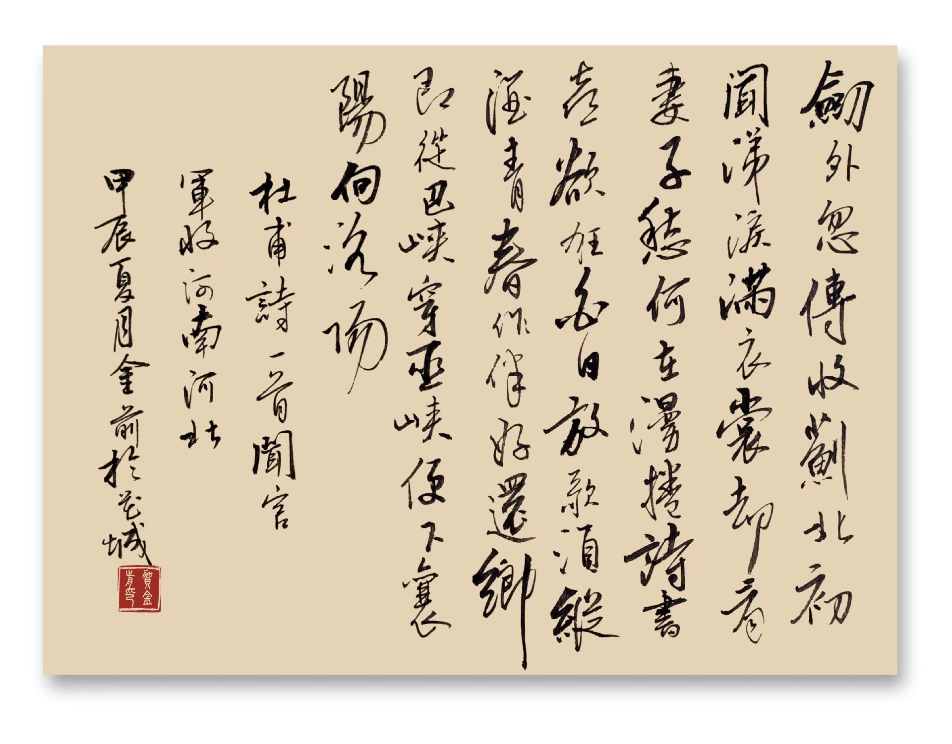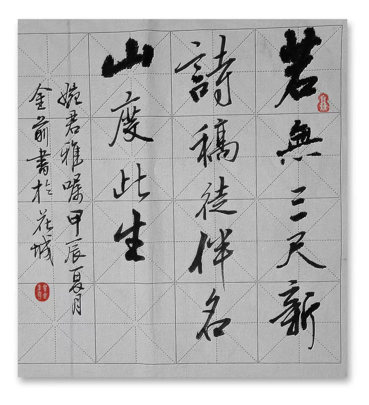 贺金前,笔名田园墨夫,湖南郴州人。中学高级教师,业余喜好作诗,舞文,挥毫。诗书为伴,陶冶性情。崇尚"腹有诗书气自华"之古训。书法崇尚二王,欧阳询,褚遂良,米芾,王铎,怀素,梁诗正,文征明等先贤,临池不辍,心摹手追。注重字外功夫,勤读书,常练笔,有短篇小说,散文,民间故事,旧体诗词,新诗,书法作品五百余篇见诸报刊杂志,文集,网络媒体,且获各种奖项。香港回归一周年全国书法比赛荣获金奖。学书感悟小文《砚边漫笔》在《书法导报上发表。