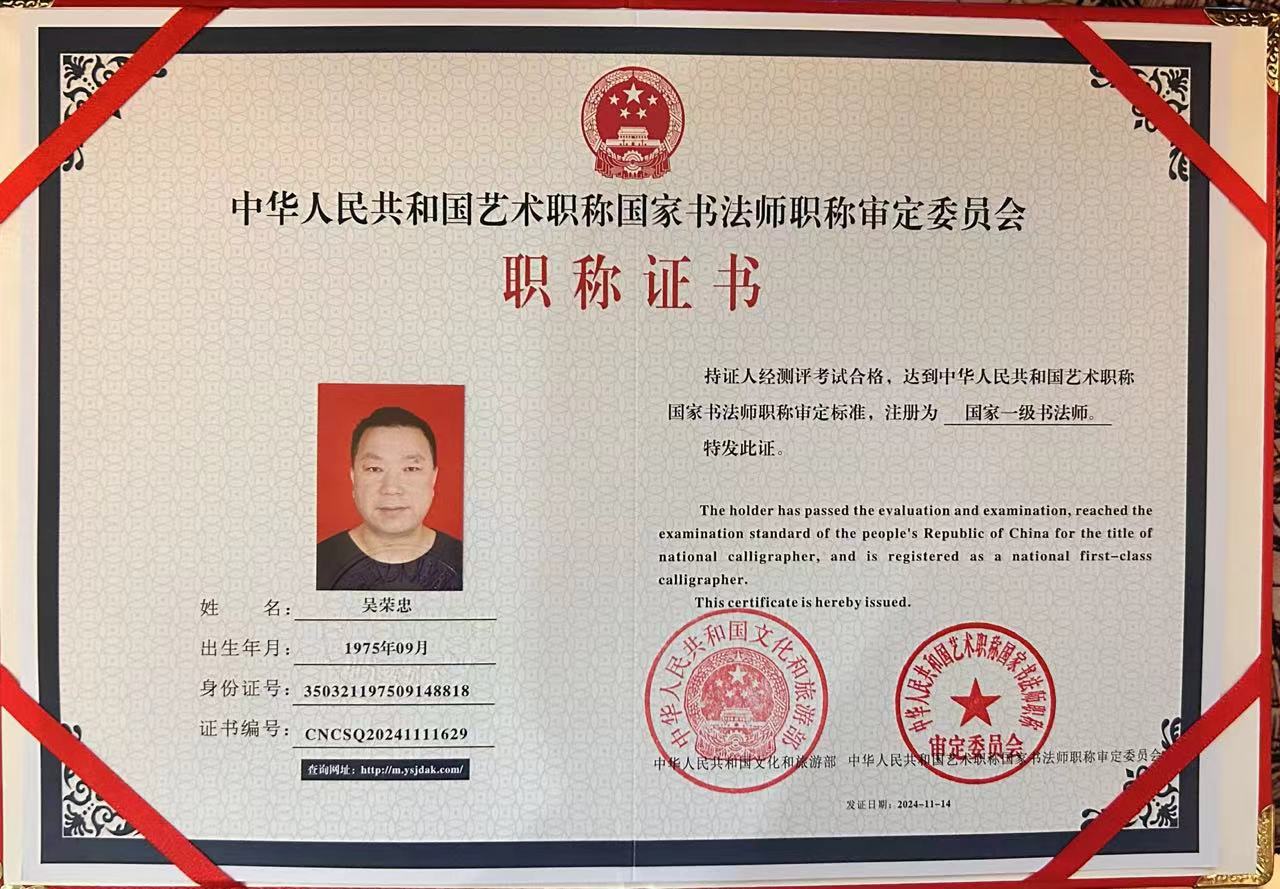 2020荣获墨韵中华全国书画活动金奖,2021作品编入中国当代书法名家作品集,2022作品编入海峡两岸书法名家献礼二十大精品,入书画家频道会员2023荣获华夏杯一等奖,作品编入大家气象精品集,入人民书画院会员,作品编入华夏杯作品集。