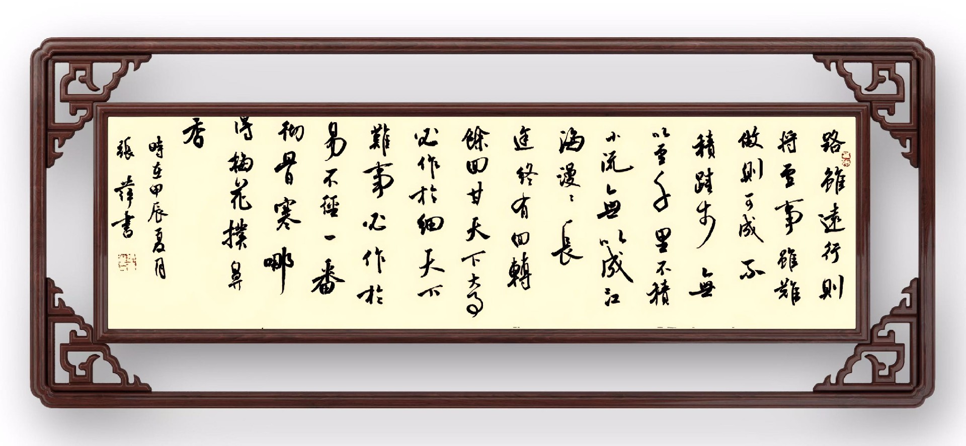 这些年,我一直在笔耕不辍 的同时 ,也在努力寻求正确的方向:书法从传统中来,历朝历代的顶尖的书法家们都在传承优秀的书法文化,守正创新,离开了传统,书法就成了无源之水,无本之木,又何来创新?反之,必将流之于浮浅,甚至误入歧途。当然这条路既遥远也坎坷 ,修身、学习并不难,难的是一辈子的坚持。我相信,我定能坚持下去!苦心人,天不负。只要咬定青山不放松,我想我会走得更远!