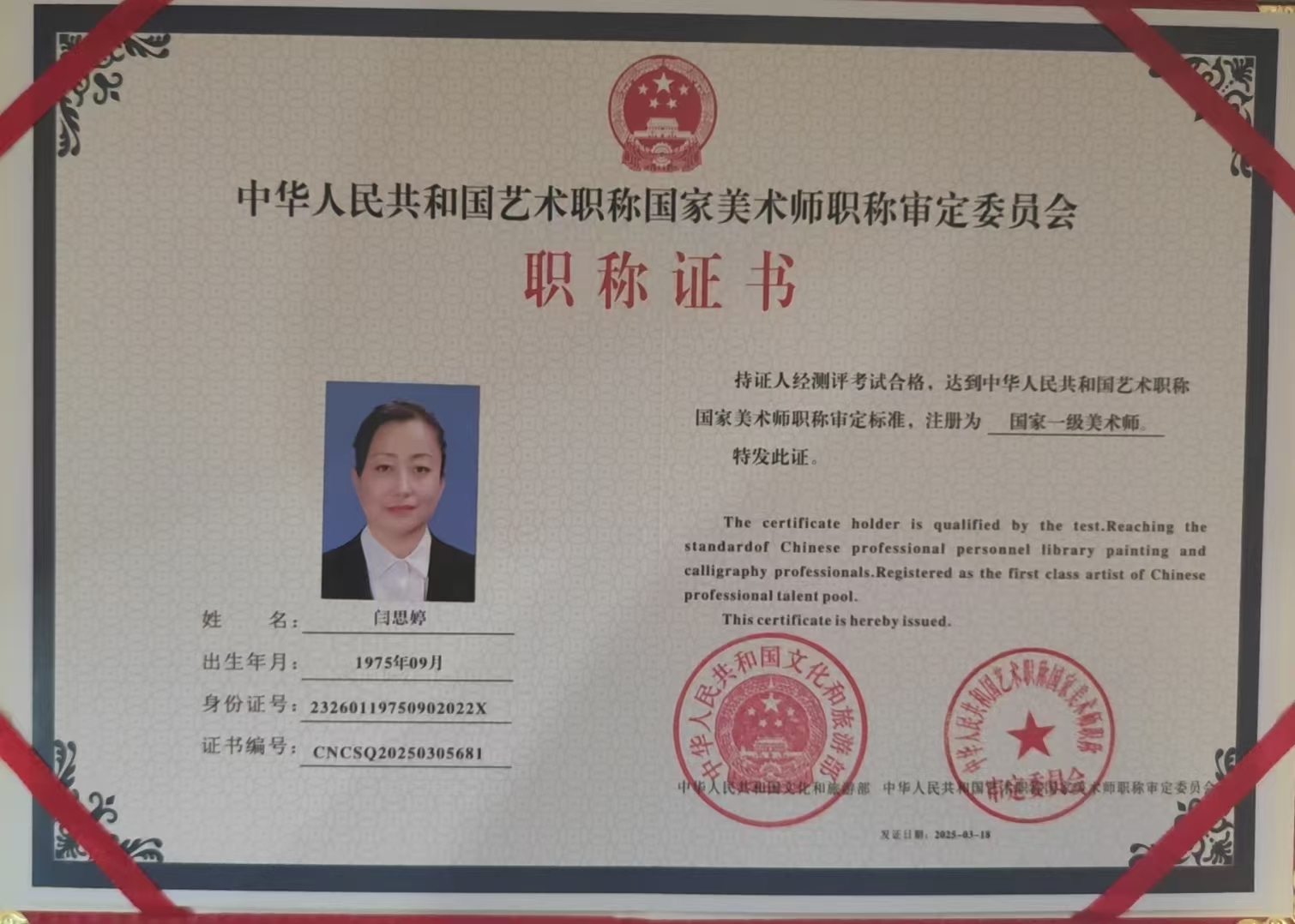 闫思婷,现为中华炎黄文化研究会炎黄书画院副院长,中华炎黄书画艺术研究院执行院长,高级教师,国家一级美术师黑龙江省工艺美术大师,黑龙江省非物质文化遗产项目鱼皮制作技艺代表性传承人,省级乡村工匠名师,黑龙江省百姓学习之星,爱辉区百姓学习之星,黑河工匠、爱辉工匠,爱辉文旅推介官,中国工艺美术协会高级会员,黑龙江省工艺美术协会理事,黑河市中俄工艺美术协会常务副会长兼秘书长,中国民间文艺家协会会员,黑龙江省民间文艺家协会会员,黑龙江建筑职业技术学院特聘讲师,黑龙江三江美术职业学院特聘高级工艺美术师,黑河博物馆特聘讲师,巾帼先进集体带头人,鱼皮技艺非遗工坊负责人,闫思婷工匠人才创新工作室领衔人,黑河市爱辉区人大代表,在2024年全省职工劳动和技能竞赛“名师带高徒”活动中被黑龙江省总工会选树为“好师傅”。