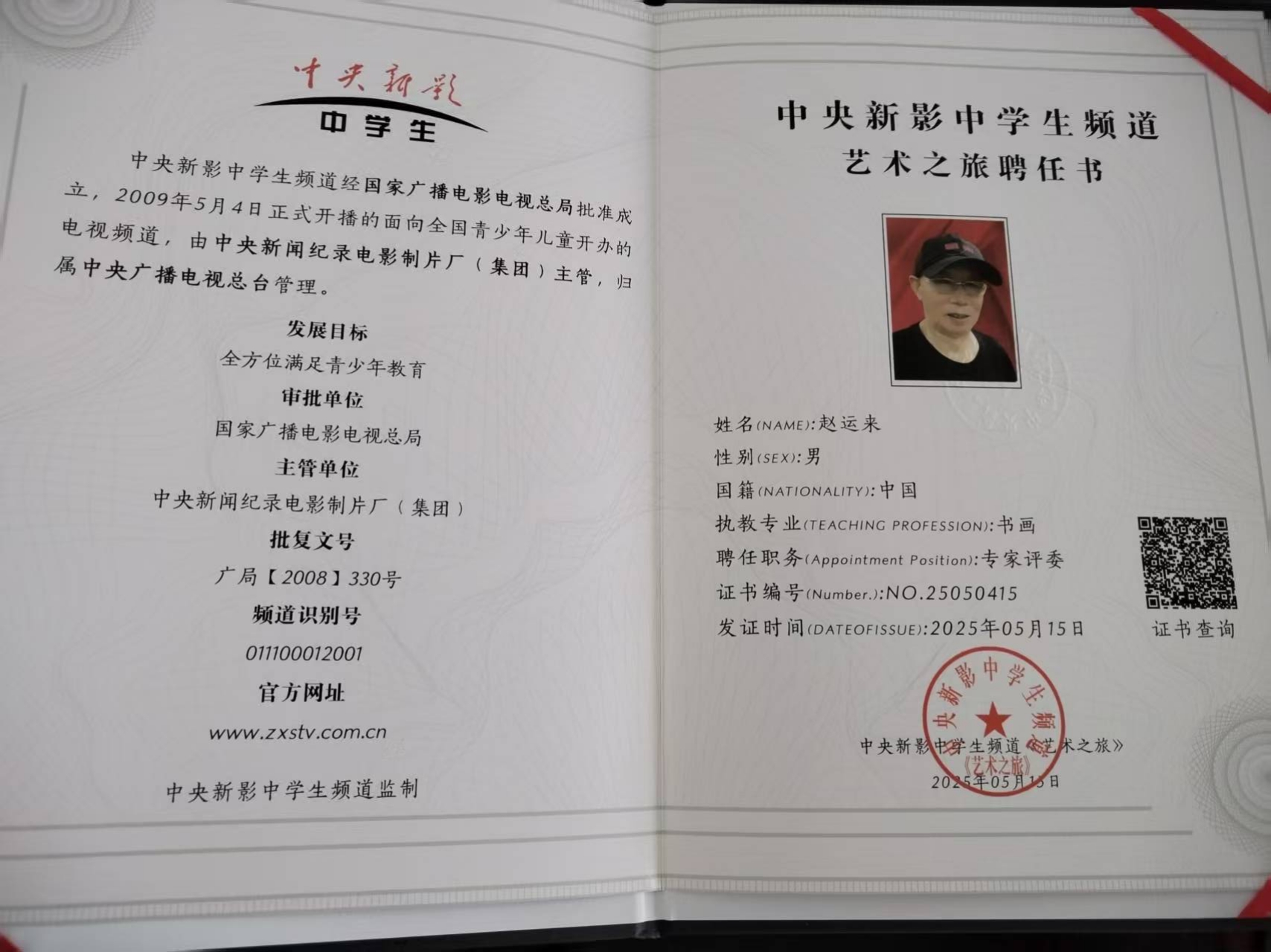 2025年5月15日被中央新影中学生频道,艺术之旅。特聘为专家评委。