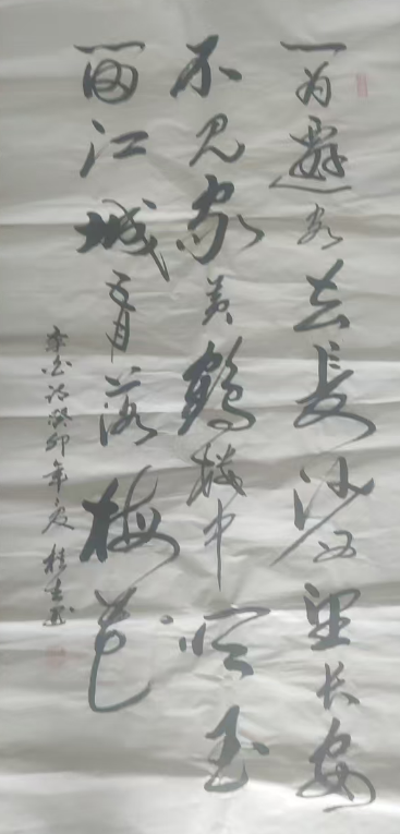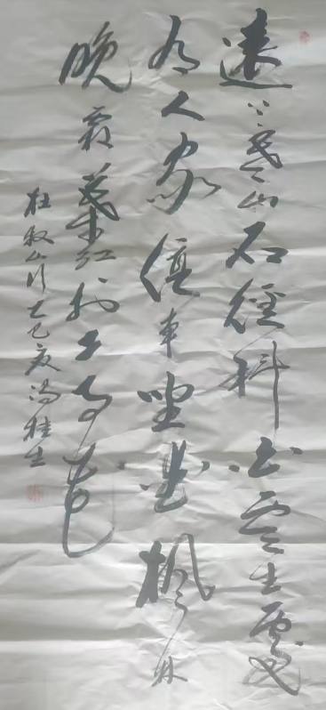 冯桂生,年龄70岁,山东省济南市莱芜区大王庄镇东上崮村,自幼喜学书法,先习正楷颜体柳体,后中老年专习学行,草书最初参加莱芜书法协会,曾担任莱芜民间艺术研究学会副会长,因平时喜爱慈善事业,多次为慈善业捐献作品,被有关单位评为“慈善大使”并在当地碑石寺院留下作品,后对草书进行专门研究多次临摹诸体,尤其对王体、毛体、怀素、张旭等古人及现代书法家的作品,取其精华,专为已用,草书作品,曾在韩国展出为中韩文化交流作出贡献并被评为中韩文化交流大使“荣誉称号”。毛泽东主席的“沁园春”雪曾多次参加国家级比赛并获一等级将,苏东坡的赤壁赋和杨慎的三国演义开篇词曾在报刊发表。经过二十余年的磨练,坚持不懈的努力,终于打造出了自己的苍劲有力,刚柔相济的个人风格成为广大书法爱好者喜爱的作品,为我中华书法的传承作出贡献。