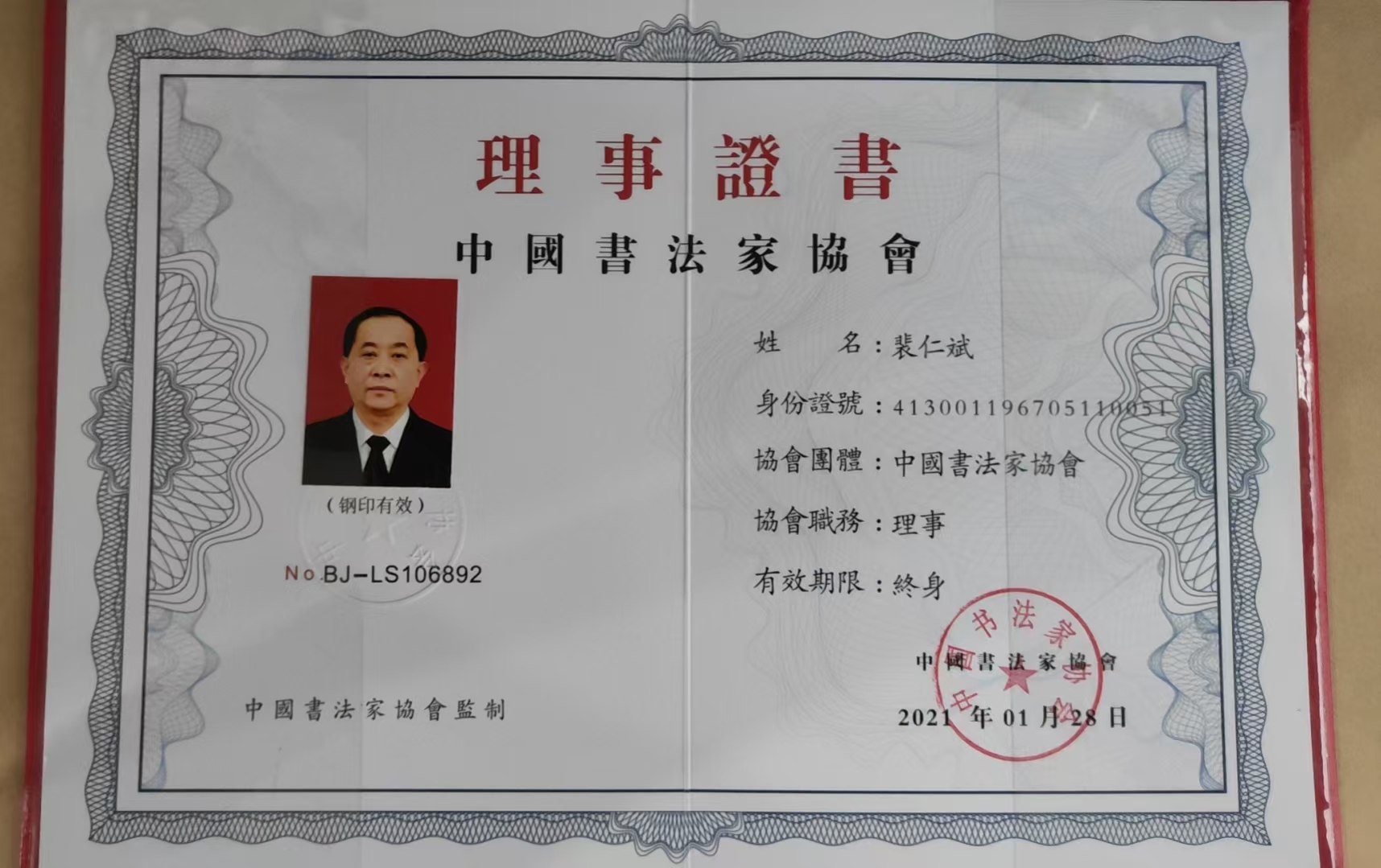 现为:国家一级书法师,中国书画家协会会员,中国书法家协会会员,中国书法家协会理事。
