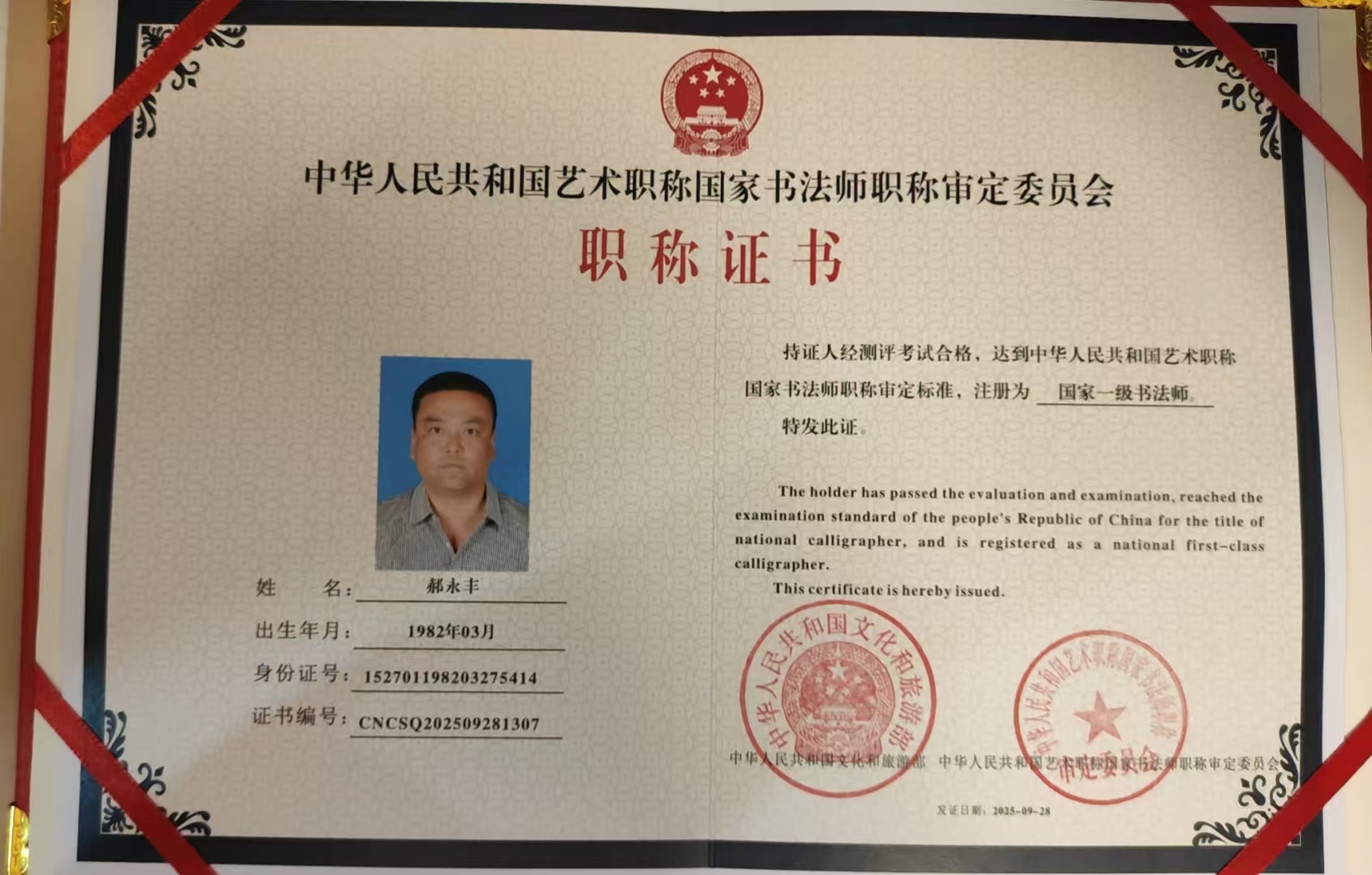 最后,我要感谢书法协会给予我这个展示自己的机会。我将以更加饱满的热情和更加坚定的信念,继续我的书法之路,为书法艺术的发展贡献自己的一份绵薄之力。现为:中国书法家协会会员,国家一级书法师