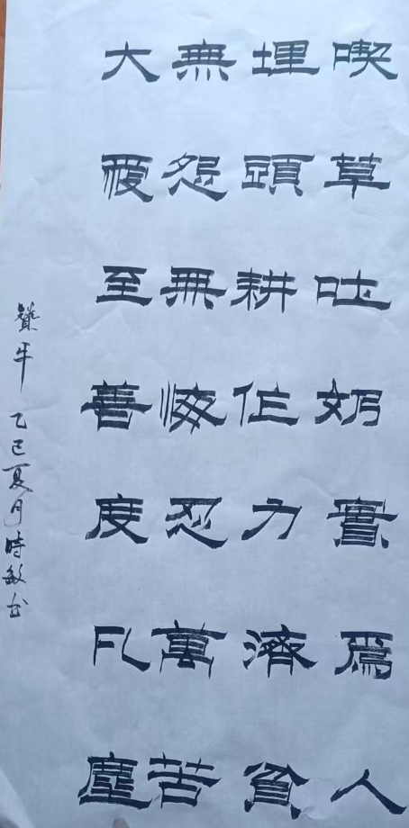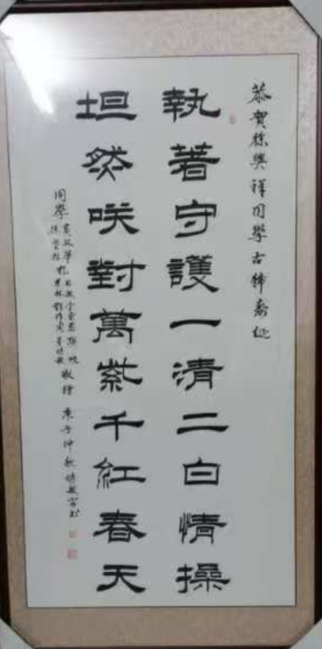 值得一提的是我為地方為社會為親友題過數不清的牌匾、對聯等。鄉親們若有紅、白、生日、喬遷之喜,都請我揮毫潑墨。讓書法走進千家萬戶,傳承中華文化,本人亦樂此不疲!