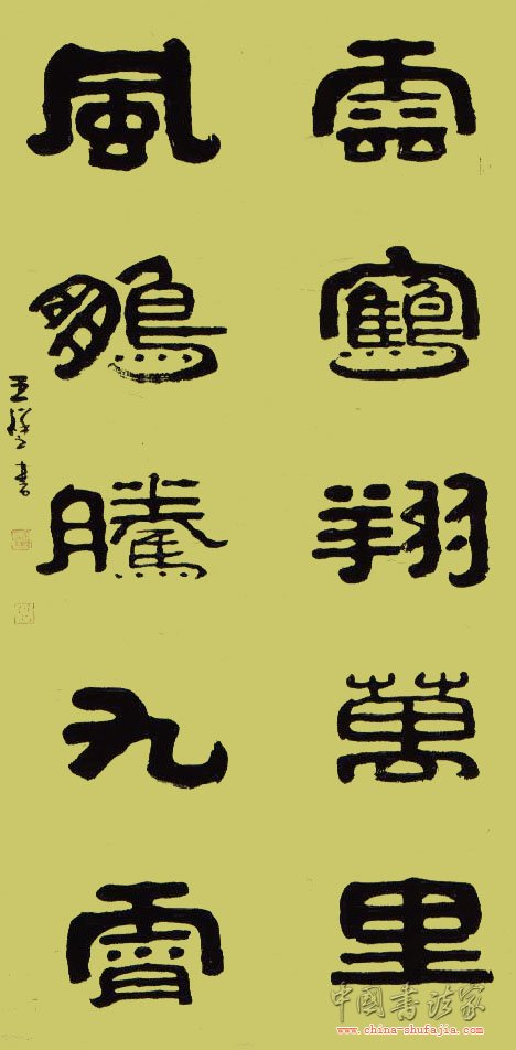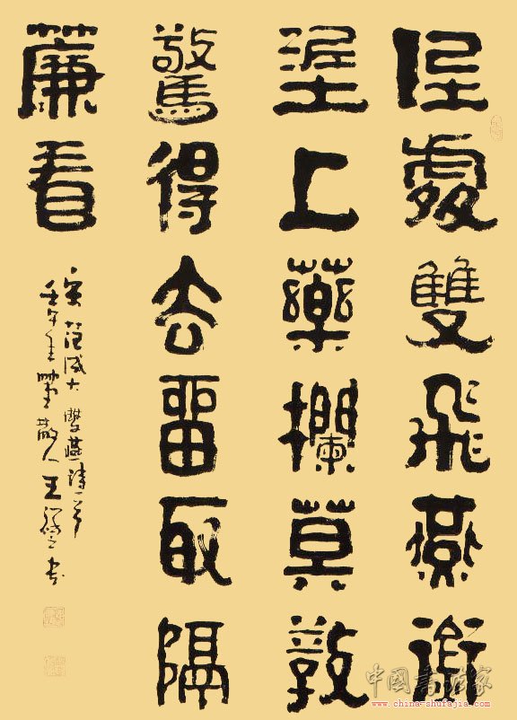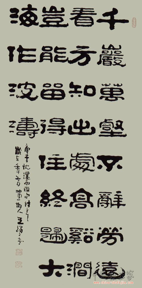 王祥之,字振羽,号竹堂散人。1941年3月生于河北省乐亭县。历任中国书协理事、中国书协中直分会常务副主席、中韩书法家联谊会常务副会长等。幼承庭训,九岁习书。其隶书古朴凝重、个性鲜明,大篆古意盎然,自成家风。 作品入选:第五、六届全国书法篆刻展,国际书法名家展,中日书法名家展等。《中国古今书法名家大辞典》等百余部大型辞书和名人典籍。近百幅作品被国内外美术馆、艺术馆及中南海等单位收藏,在黄山、泰山等多处留有碑刻或摩崖石刻。江西弋阳建有《王祥之书历代名人咏弋阳碑廊》,共刻有诗碑 30块。