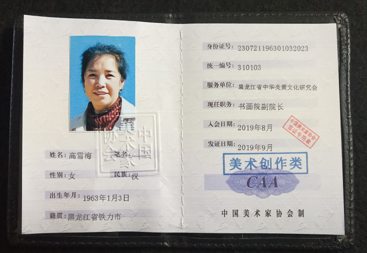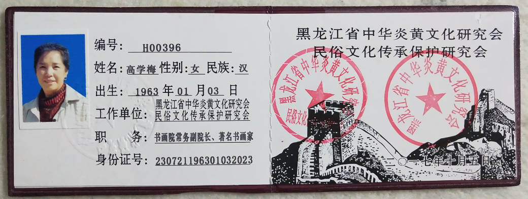 高学梅: 现为:中国美术家协会会员:黑龙江省中华民俗文化传承保护书画院常务副院长:中国林业文联美术家协会会员;中国林业文联美术家协会铁力分会理事;中国林业文联美术家协会冰雪画会,理事:伊春市美术家协会理事