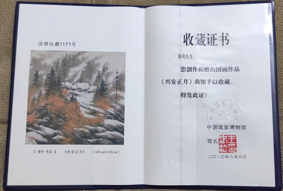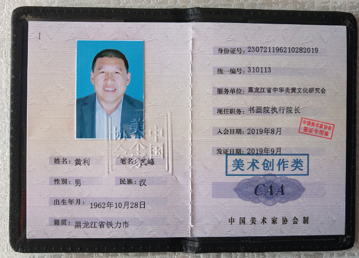 黄利:笔名:艺峰,斋号:藏山斋。1962年生于黑龙江省铁力市,中共党員,铁力市第五小学校,副校长。 现为:中国美术家协会会员;国家一级美术师;国家一级美术家:中国工艺美术大师;中国书法家协会会员;中国篆刻家协会会员;中国楹联学会书法艺术研究协会会员;中国书法研究院艺术委员会会员;中国教育电视台水墨丹青栏目组济宁分院副院长;黑龙江省美术家协会会员;黑龙江省中华民俗文化传承保护书画院总院常务副会长,执行会长,艺术总监;炎黄书画报社副社长;黑龙江省老艺术家协会诗书画印研究院、院士副秘书长;中国林业文联美术家协会会员;中国林业文联美术家协会铁力分会副主席;中国林业文联美术家协会冰雪画会副会长;伊春市美术家协会副主席;伊春市书法家协会理事;铁力市地书书法家协会;主席。由中国国艺人民书画家院,中国人民艺术家协会,中国文化下基层管理委员会,监制并颁发收藏润格证书;中国书画家协会润格鉴定委员会颁发润格证书;中国文化部艺术研究中心,非物质文化遗产保护专业委员会,颁发润格证书;《庆祝中华人民共和国成立70周年》官方推荐2019年“最具收藏价值的艺术家”匾牌;并颁发中华国礼、嘉宾国礼荣誊证书。2017年5月庆祝习主席来伊春一周年,中国梦“绿水青山是金山银山,冰天雪地也是金山银山”大型主题画展,三幅巨作分别在展览大厅的东、南、西三个主要位置展示,《大美伊春》,《万山红遍》,《兴安春来早》伊春市委第一书记高环书记与我合影留念。三幅作品在中央书画频道新闻里播报,官方网站进行报道,官方己出书《中国梦》。三幅巨作作品被伊春市政府收藏,挂在伊春市1000多平方米,文化馆,显要位置上。2018年6月为庆祝伊春市成立70周年,新建的美术馆,我的三幅作品有两幅4.3米巨作,在伊春美术馆门口展示。2018年7月伊春市市长和德国东根市市长,在伊春美术馆举行文化艺术交流笔会,我的牡丹花《春满乾坤》当场被伊春市领导捐送给德国东根市市长。2019年4月29日中国林业文联美术家协会冰雪画协会,举办全国各地画家冰雪画首届名家邀请展,本人六幅巨作品挂满了一个展厅,获得了专家一致好评,取得了优异的好成绩。    2020年3月份荣获:中华国礼艺术家委员会当代艺术家标杆,并颁发荣誉证书。2020年十三届全国人大三次会议,全国政协三次会议,全国两会官方推荐“德艺双馨”艺术家,并荣获证书,奖牌瓷盘。全国两会官方推荐黄利为德艺双