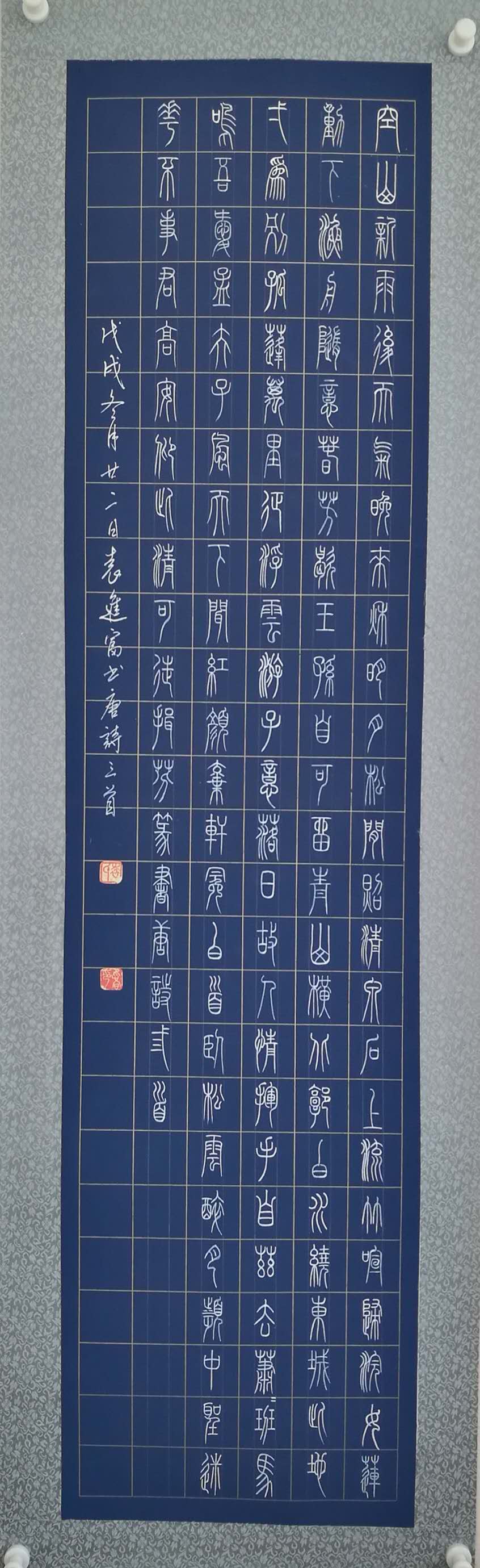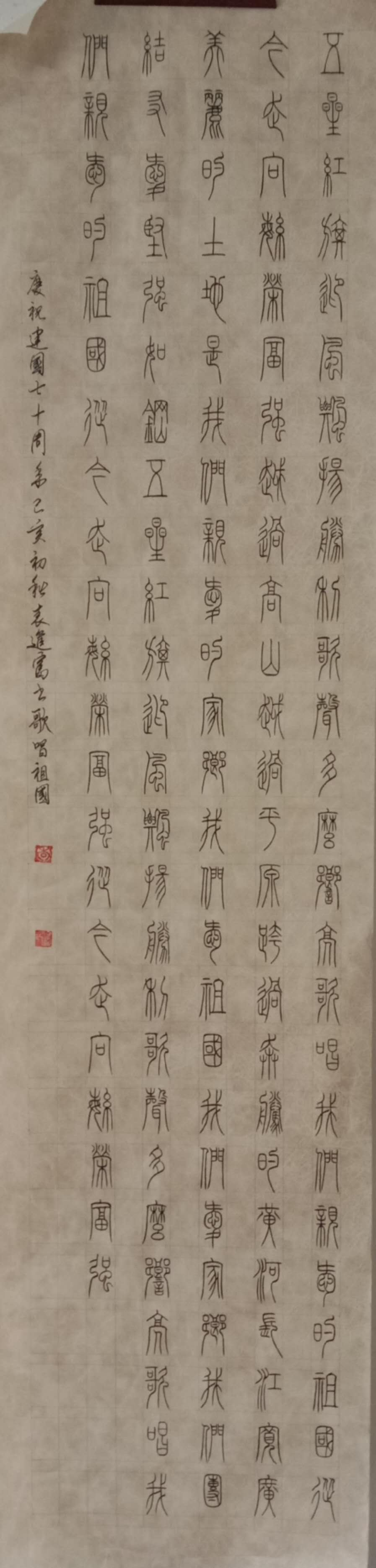 袁进富,生于一九五七年,九岁习书,本人酷爱书法,篆刻。潜心研学书法五十余年。书临赵孟頫六体千字文,道德经,心经。欧阳询心 经,赵之谦的篆书,邓石如篆书弟子职,心经。王羲之的行书,兰亭序等。书作有,小楷金刚经三十余部,临赵孟頫四体千字文,篆书毛泽东诗词一百首,毛泽东诗词一百五十首,近期完成唐诗三百首,小篆体百米长卷作品。曾多次参加区市省的书法大型展览活动。连续六年参加黑龙江中华炎黄文化研究会书画院举办书画展,分别荣获书法作品一二三等奖,现聘为炎黄书画院常务副院长著名书法家。