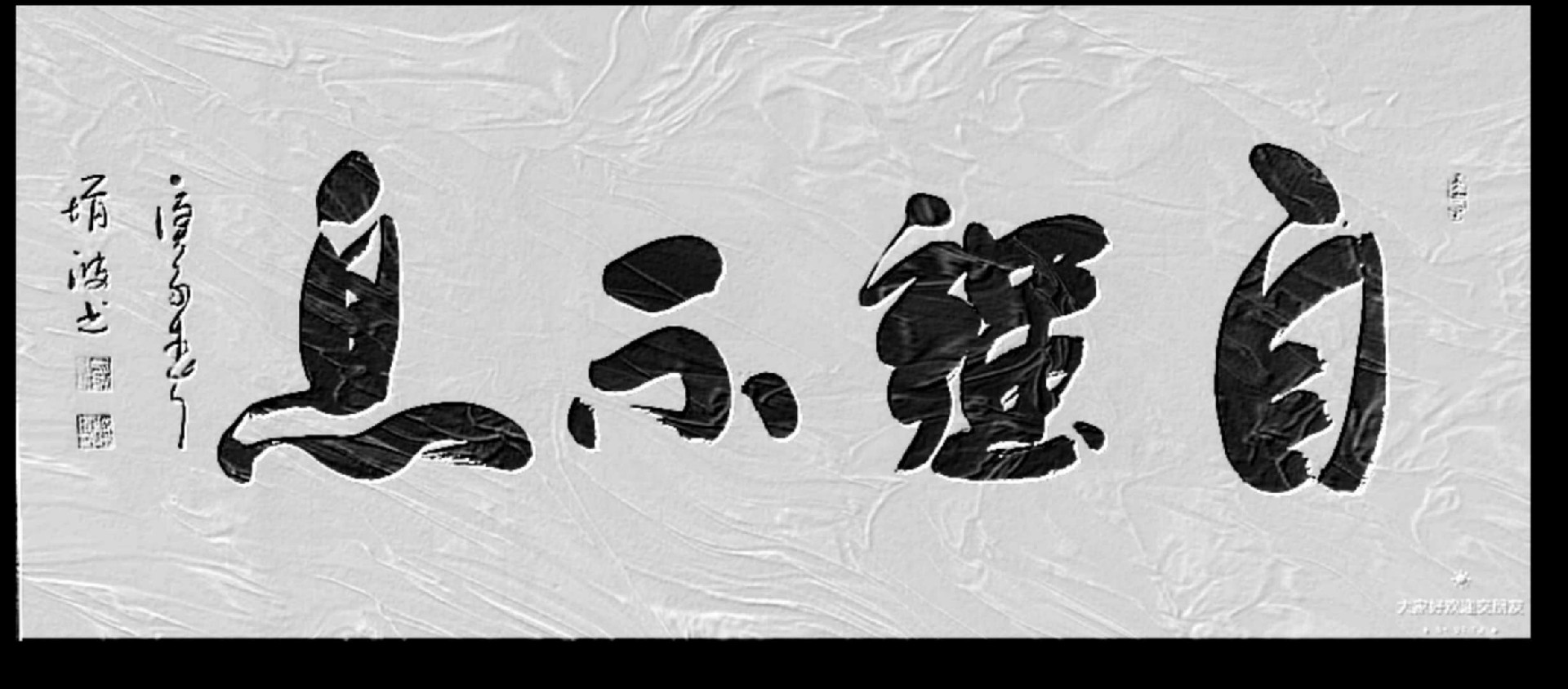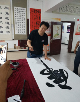 作品中“竹”、“剑”、“龙”、“精气神”、“龙吟虎啸”等字彰显其一泻千里、掀天动地的奔涌和宣泄,不失热情、奔放而有节制;“寿”、“道”、“福”、“鹰”、“佛”、“虎”等字,或清劲潇洒,结体自由,穿插挪让,相映成趣;或纵横取势,变化多姿,不落俗套,出新意于法度之中,收奇效于意想之外;或与时俱进,阔步创新,妙笔生花,意境深奥,艺术体与美学完美结合。其运笔矫健劲拔,锋颖多变,顿挫圆转,挥洒自若,用墨浓而干,墨色黝黑如漆,墨韵飞动,更添风采。