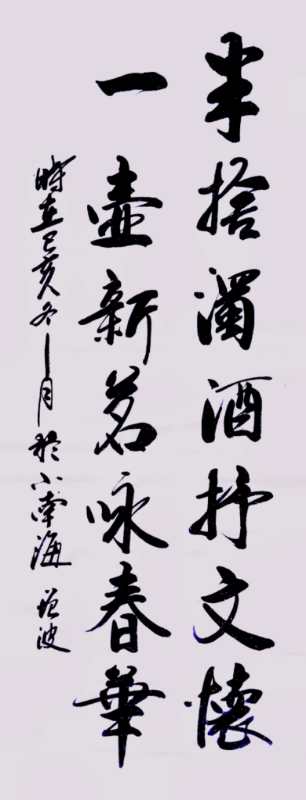 冯增波,1961年生,号浪涛居士,河北邢台市人,现为河北省书法协会会员,中华人民共和国书画名家一级书法师,中国酒业书画艺术家协会副秘书长。自幼酷恋书艺,志学之年,潜心翰墨。近三十余载秉持恒心,无间临池之志,心摹手绘,浸淫于钟、王,道正功深,书风趋于端庄古雅。摹古功夫颇深,书法融会贯通,博采众长,而主要取法于二王之神髓,素、旭之张力,作品笔力矫健,遒润爽俊,气味古淡,行笔流畅,气韵连贯;中锋行笔,线条圆劲,骨力嶙峋内含,如锥画沙,力透纸背,极具张力。