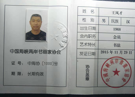 王凤才汉族号南山居士,河北省唐山市人,十岁学习书法。师承田英章老师。初学柳体,后学欧体。指法沉实。力贯豪端。八方充满更无假于外力。把欧体的铁画银钩和挺秀之美表达得淋漓尽致。潜心揣摩,遍临名帖,勤奋自勉,笔耕不辍,不慕虚名。2015年赴台湾举办个人作品展,同年参加庆祝抗日战争胜利70周年全国书画大赛金奖。2016年兰亭杯书法大赛一等奖。《书法报道》,《书法报》等多家报刊杂志专版刊登介绍其艺术成就和作品,作品被香港,韩国,新加坡,美国等国家和地区团体,组织,个人,艺术馆收藏。现为中国书画家协会会员,中国书法家协会会员,中国海峡两岸书画家协会会员,全国名人书法艺术界联合委员会,河北省书法家协会理事,唐山市诗书画印研究院副院长。