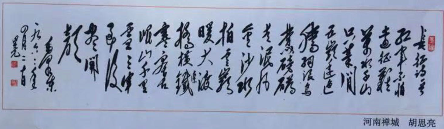 胡思亮、男、1947年生,住郸城钱店慎邓庄,退休干部。现任中国老年书画研究会会员,北京书画艺术研究院院士,河南省书法家协会会员,郸城县第一届毛体书法研究会副会长,县书法院特聘书法家,县书协, 老书会分会长其作品在全国性举办的书法大赛上曾多次获奖,多部作品被《中国爱国书涵名家大典》《全国书画作品集》等入编出书。在纪念毛泽东诞辰120周年书写的长征诗已被毛主席纪念堂、毛主席故居,井冈山博物馆,中 国历史博物馆等永久收藏。
