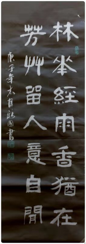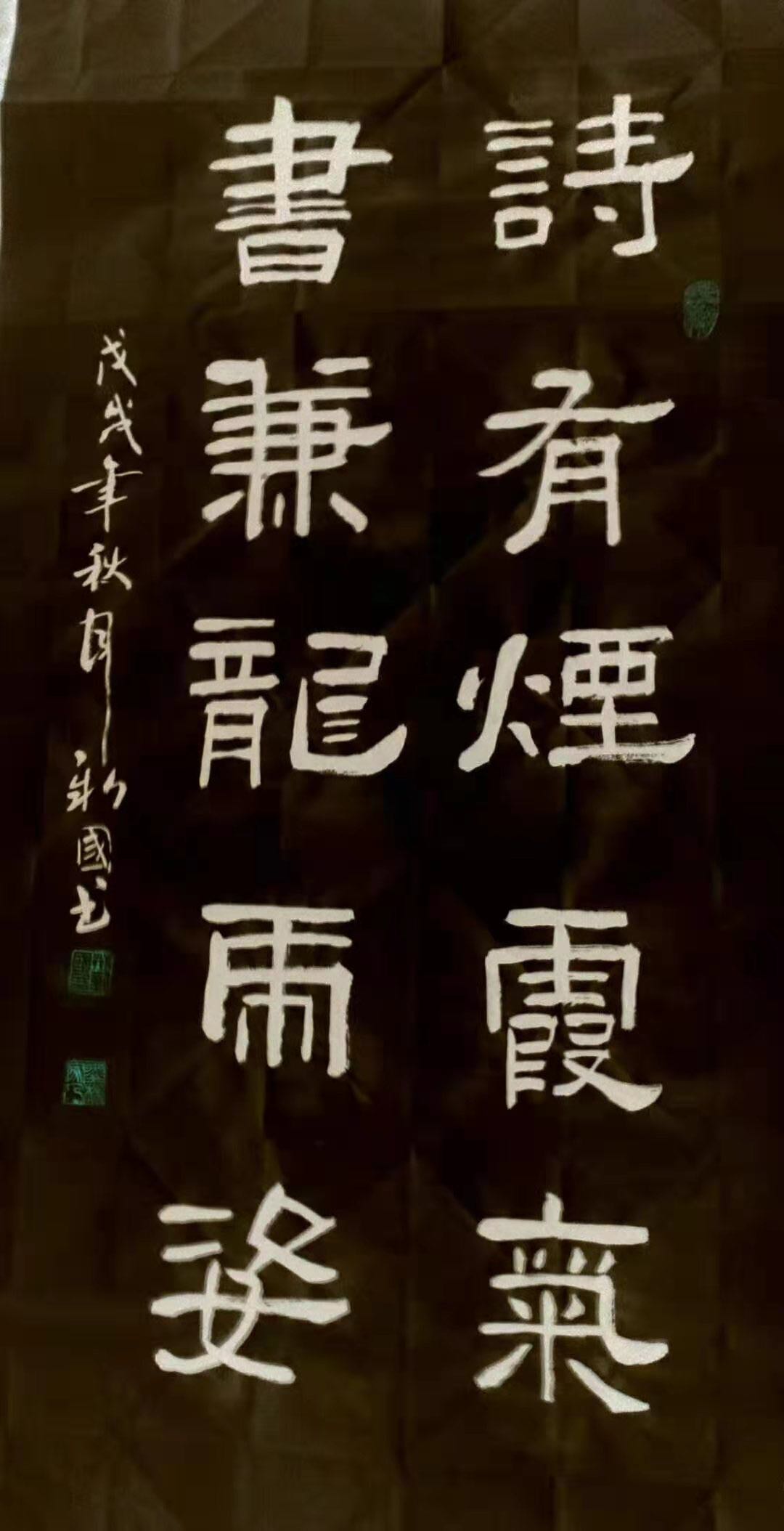 荆新国性敦厚儒雅,敏于事而纳于言,处事谨慎周密,有谦君子之风。其书法诸体兼善,于汉隶最为擅长,以张迁碑为根十基,西狭颂为辅。其书作呈现古茂厚重、平实端庄、老辣天真之境,一笔一划法度森严,其状如屈铁枯藤。蹈先贤之气象,舒自家之胸襟。近年又旁涉行草和毛体,其行去师法王羲之、颜真卿诸贤。因其汉碑元雄厚根基,故其行草孙过庭的气厚神清,刚健婀娜,行气通透。用笔奔放自如,沉着痛快。章法腾挪避让,润燥相间。为艺弘毅思远,为同道称慕。